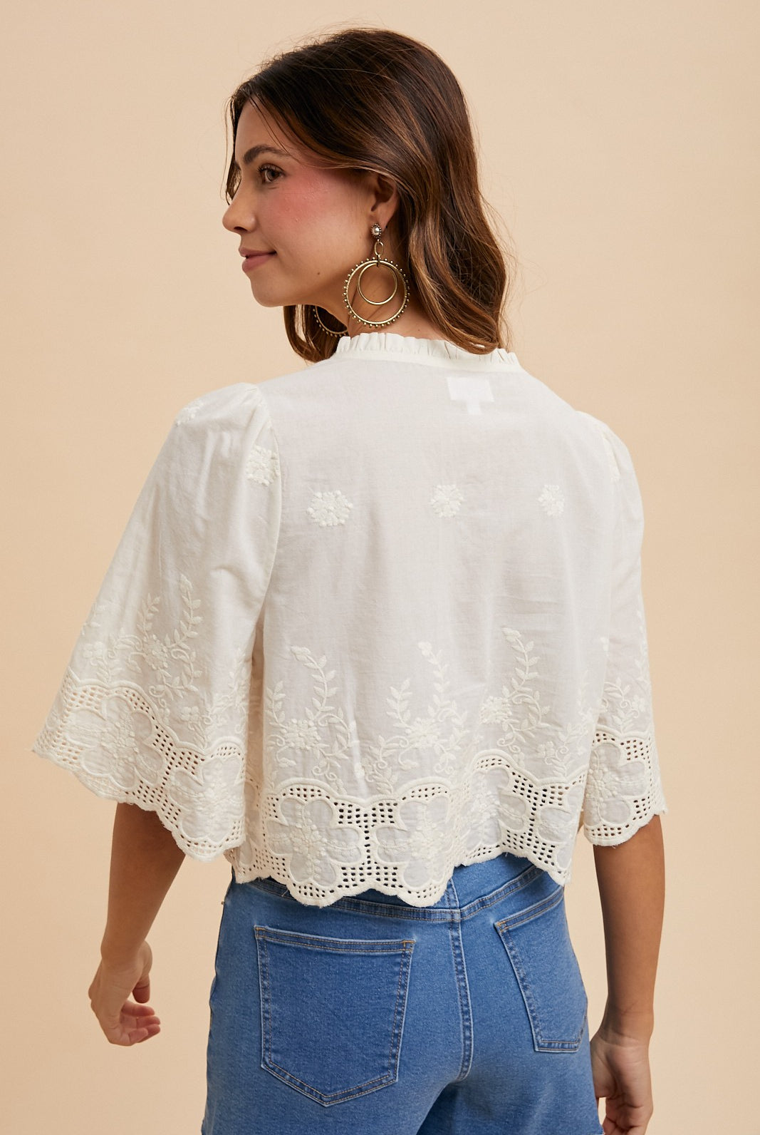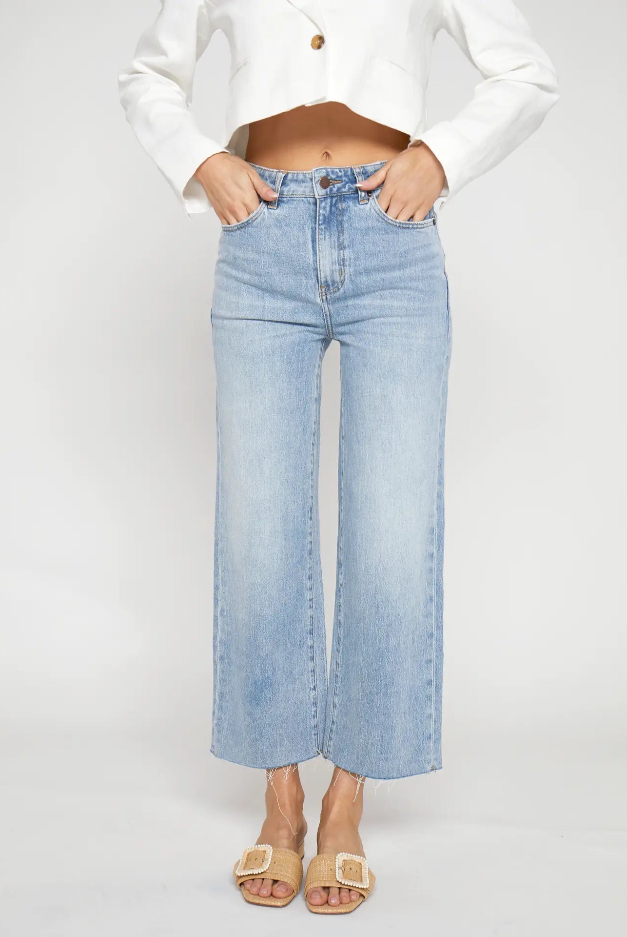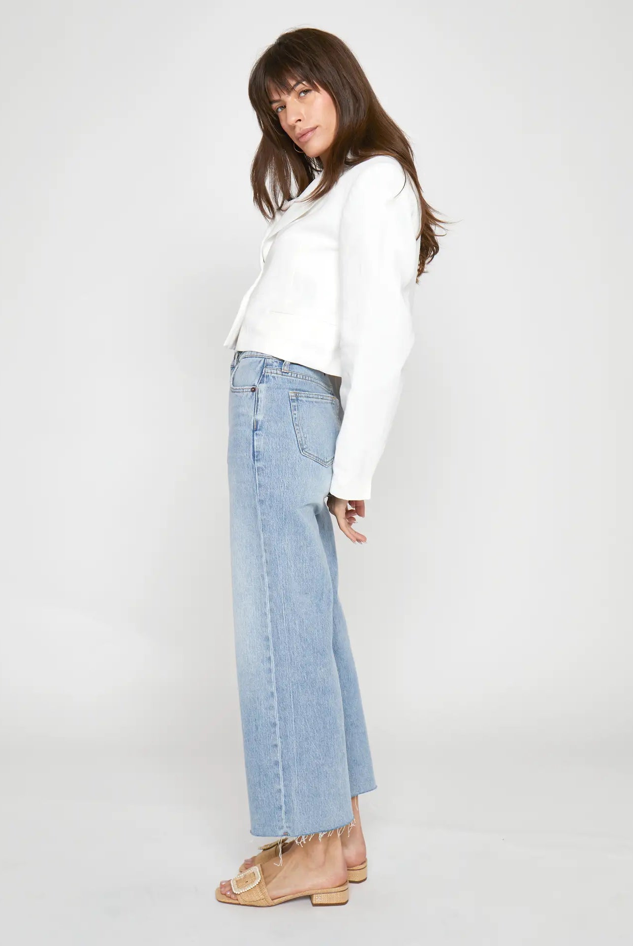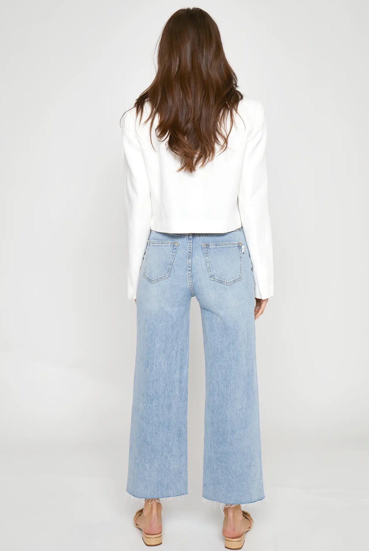 - Relaxed, oversized silhouette with raw hem details and ladder stitching