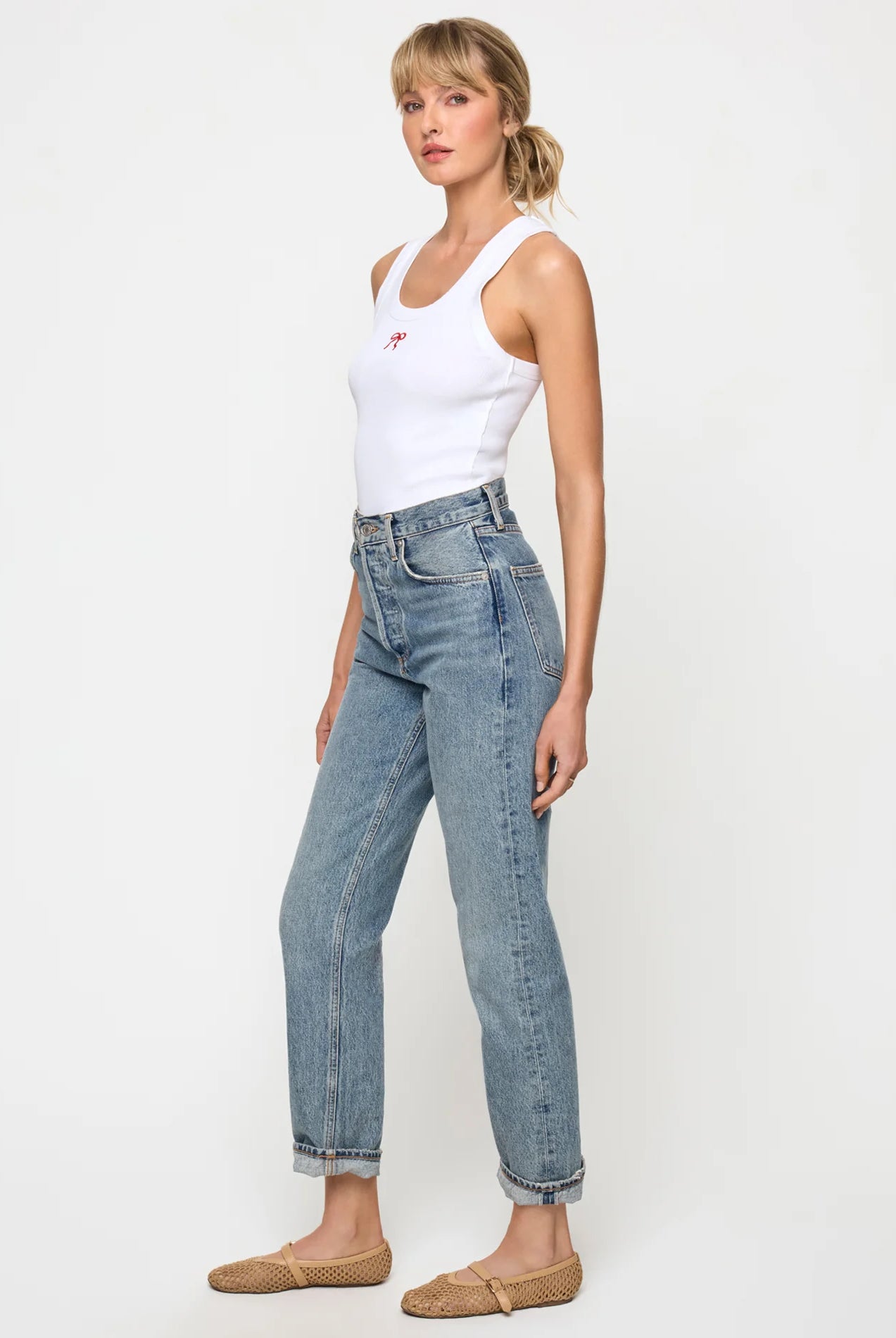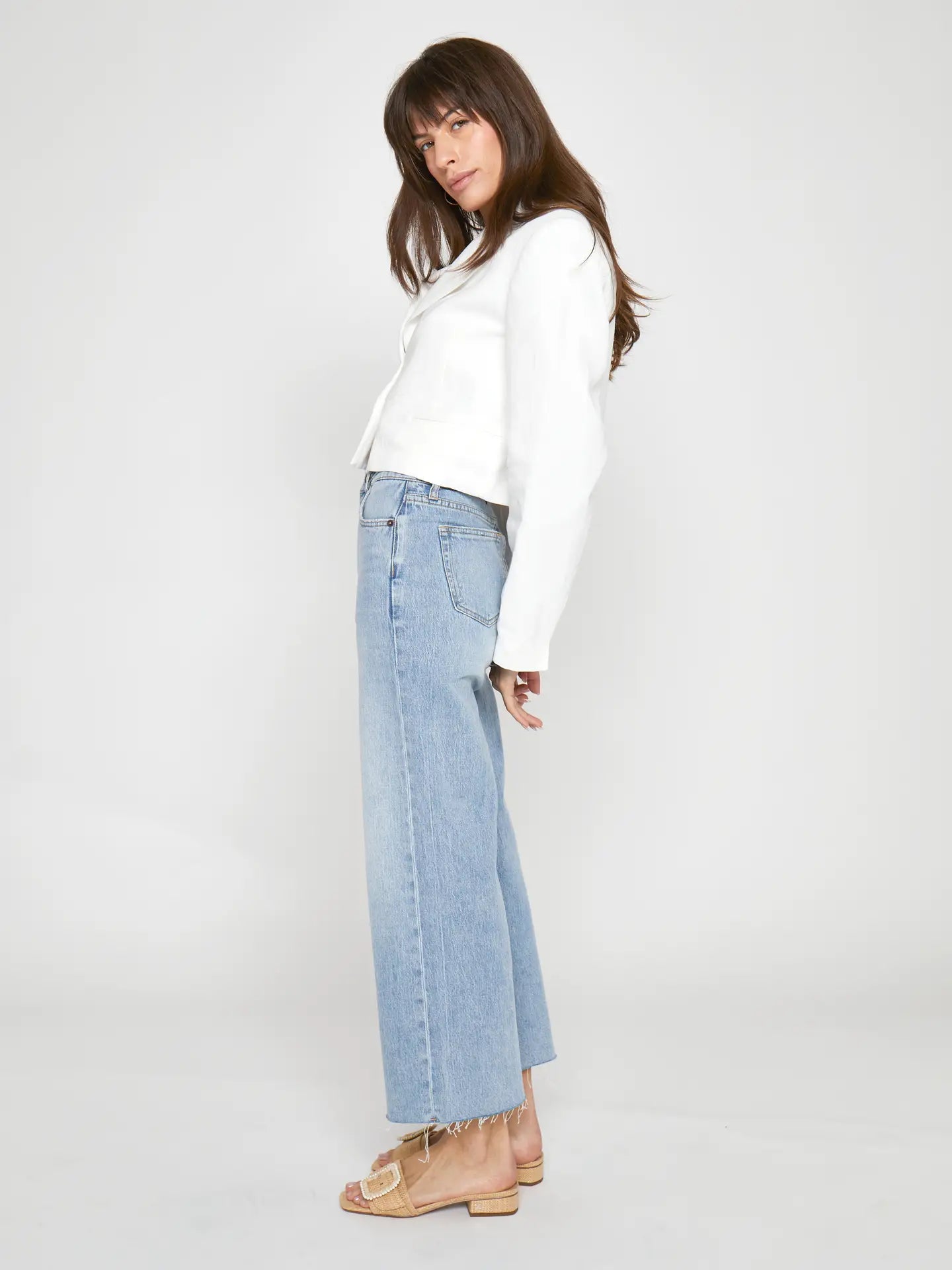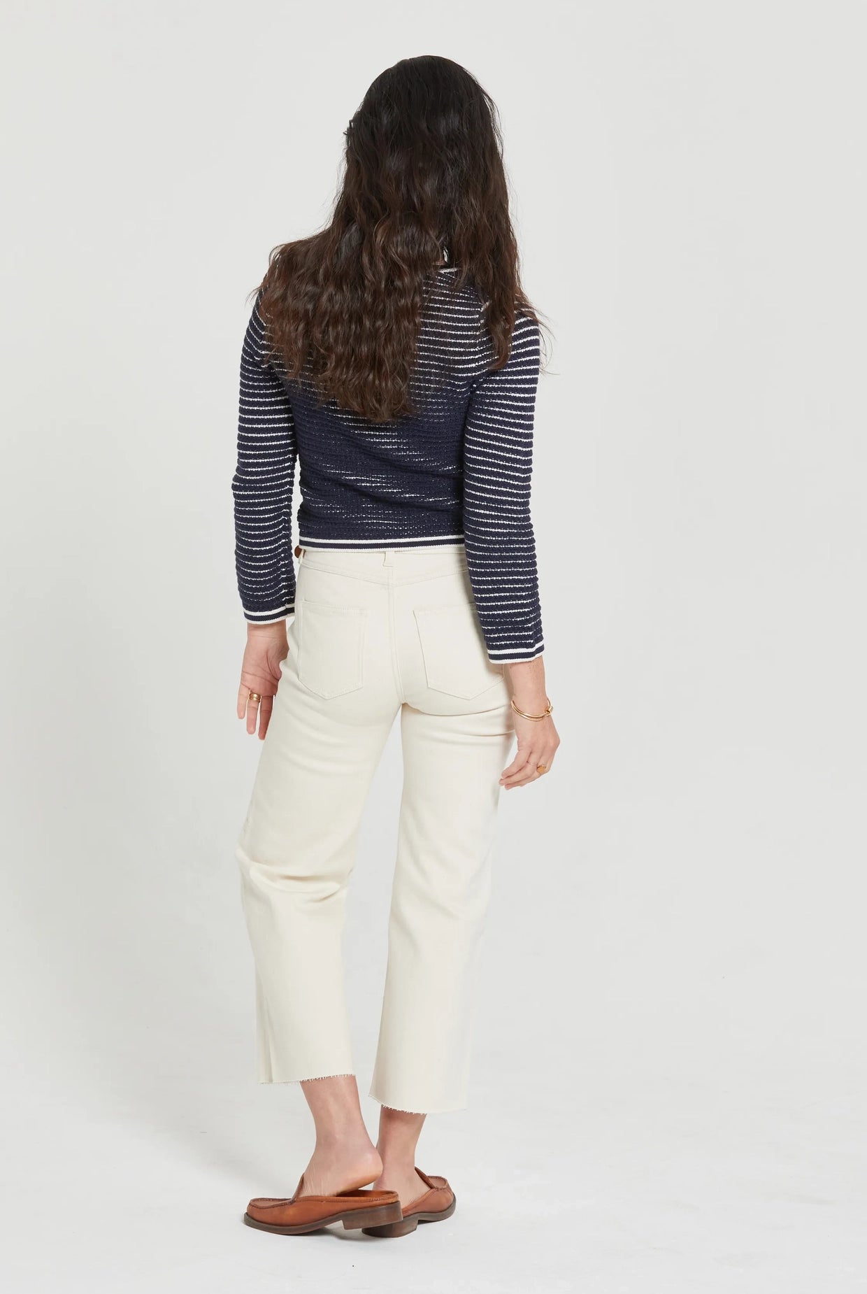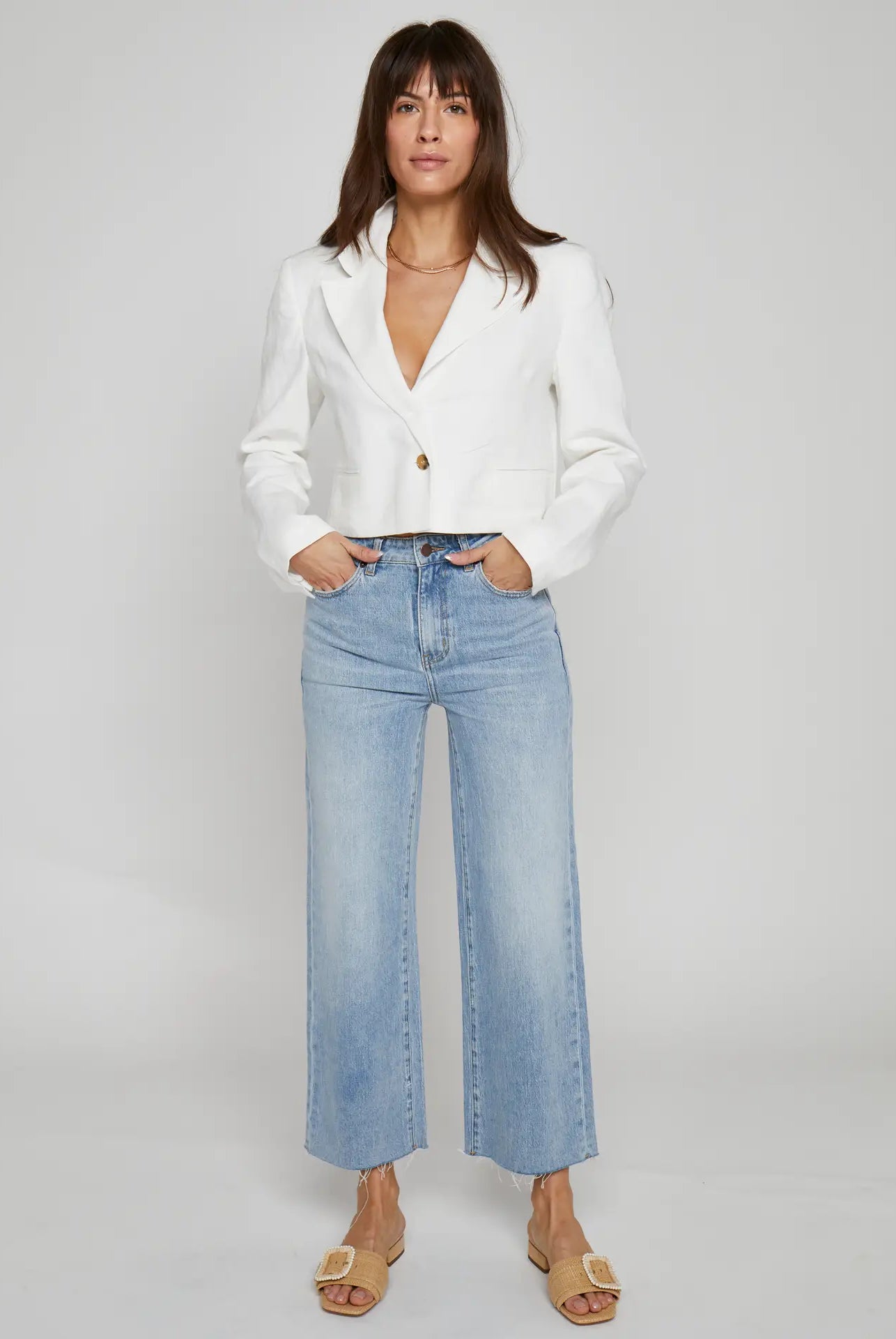 - Relaxed, oversized silhouette with raw hem details and ladder stitching