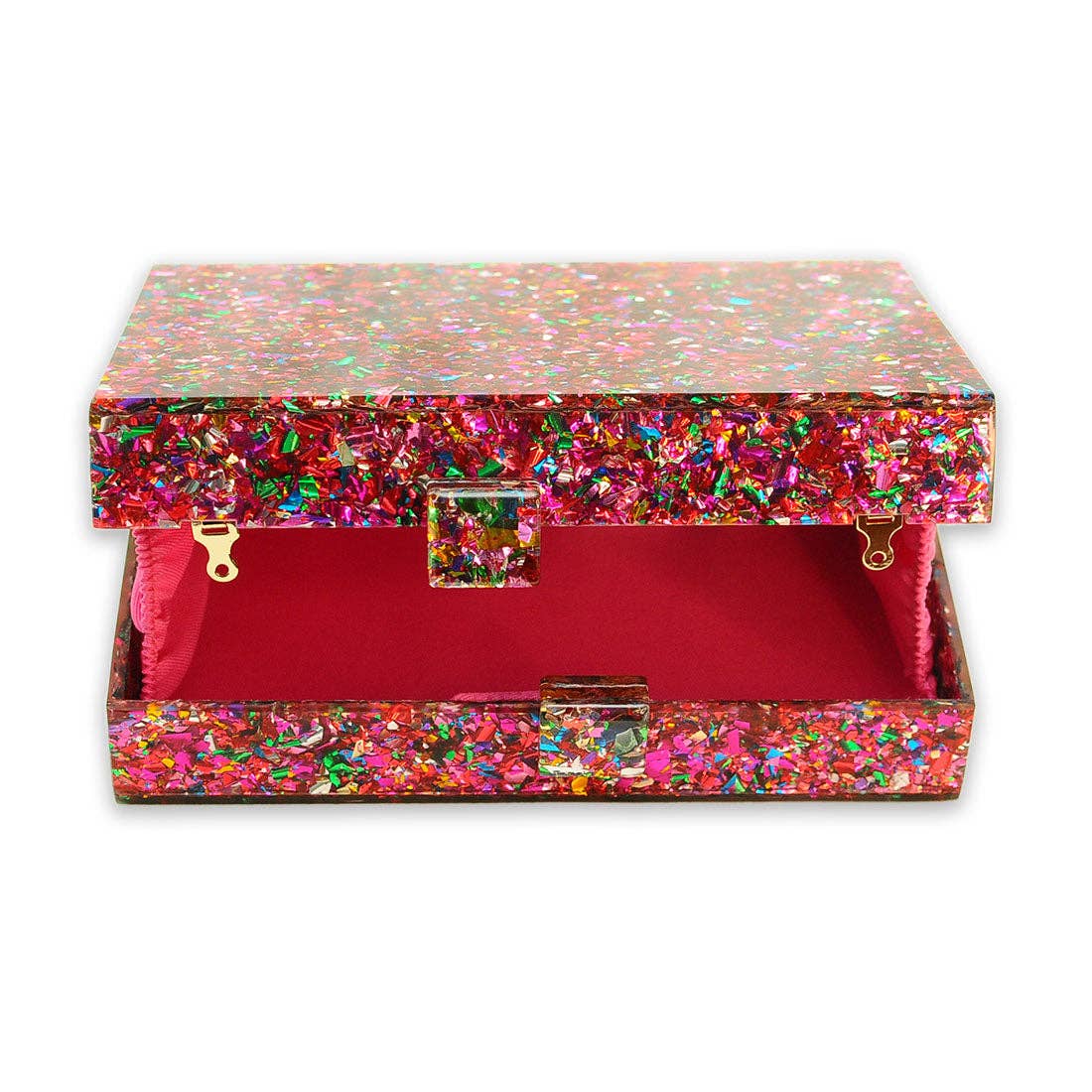 Give your outfit a shock of glam rock electricity with this Cyndi clutch, featuring a gold and silver encapsulated glitter lightning bolt inlaid in hot pink metallic confetti acrylic and polished to a mirror shine. With a hot pink fabric liner, removable gold chain shoulder strap, and plenty of space inside for your night-out essentials (any cell phone, keys, lipstick, and our slim Card Wallet), this clutch is a truly electrifying addition to any outfit.