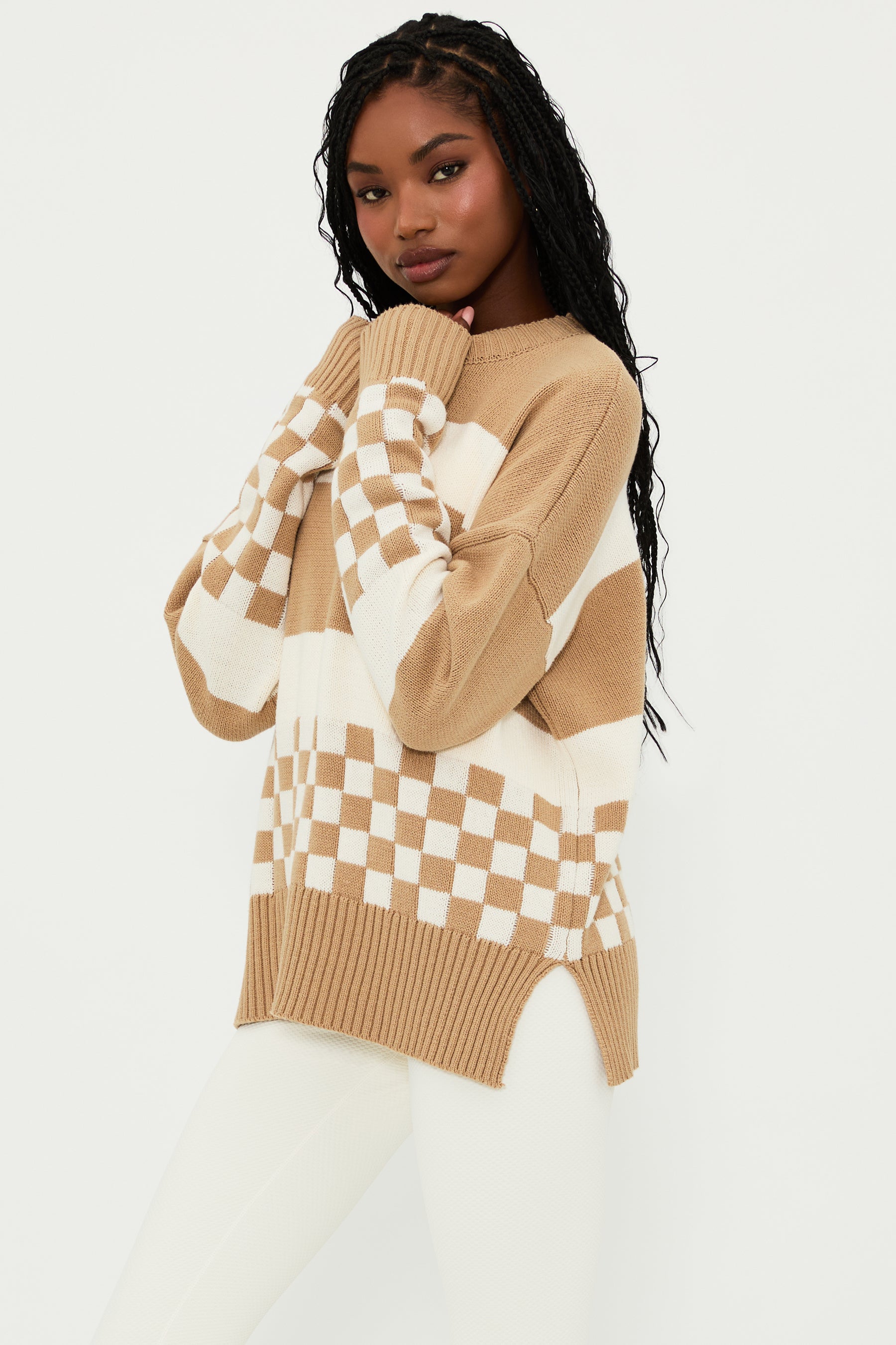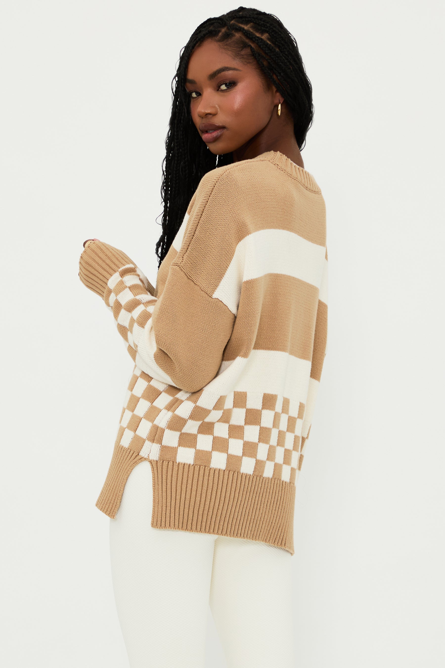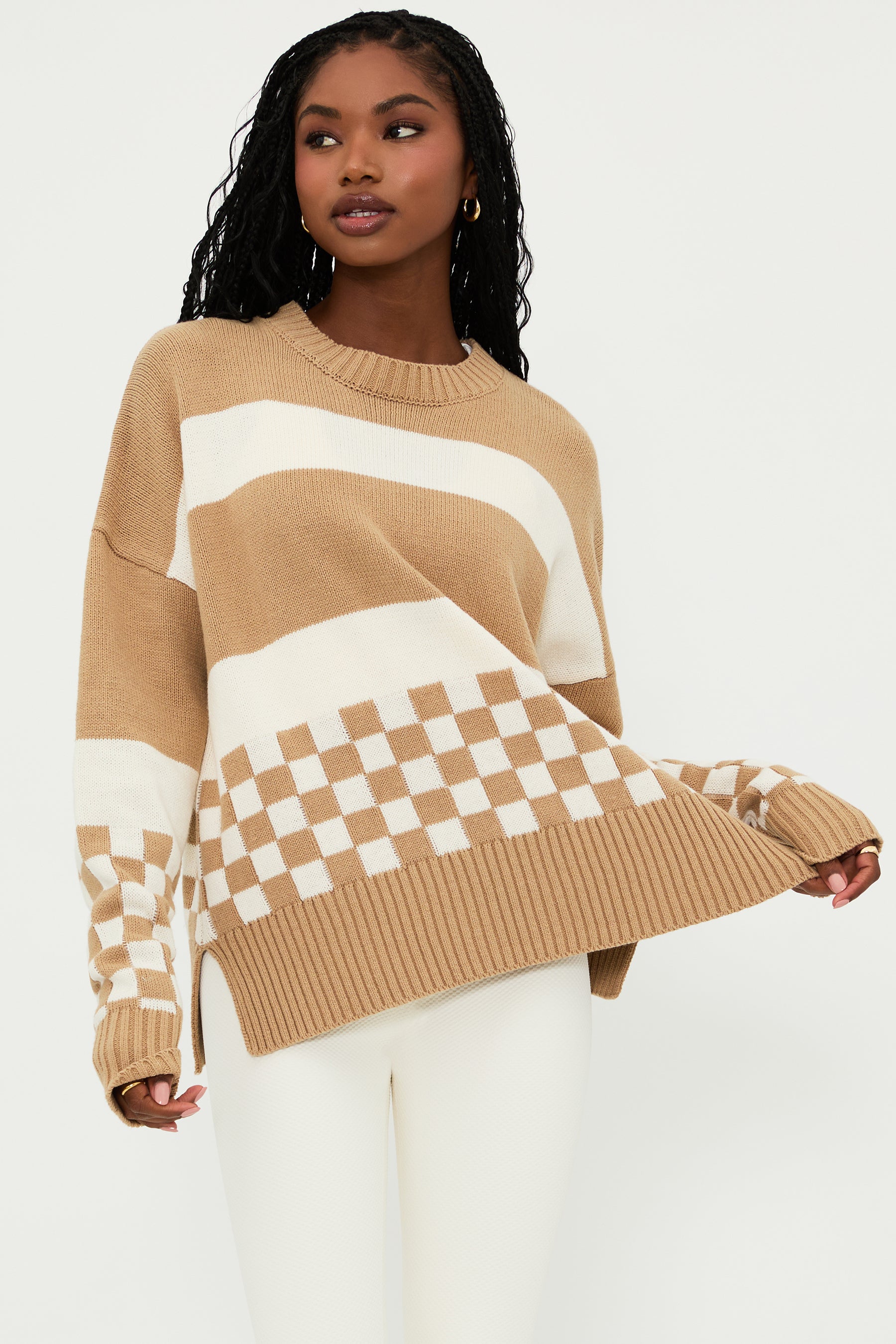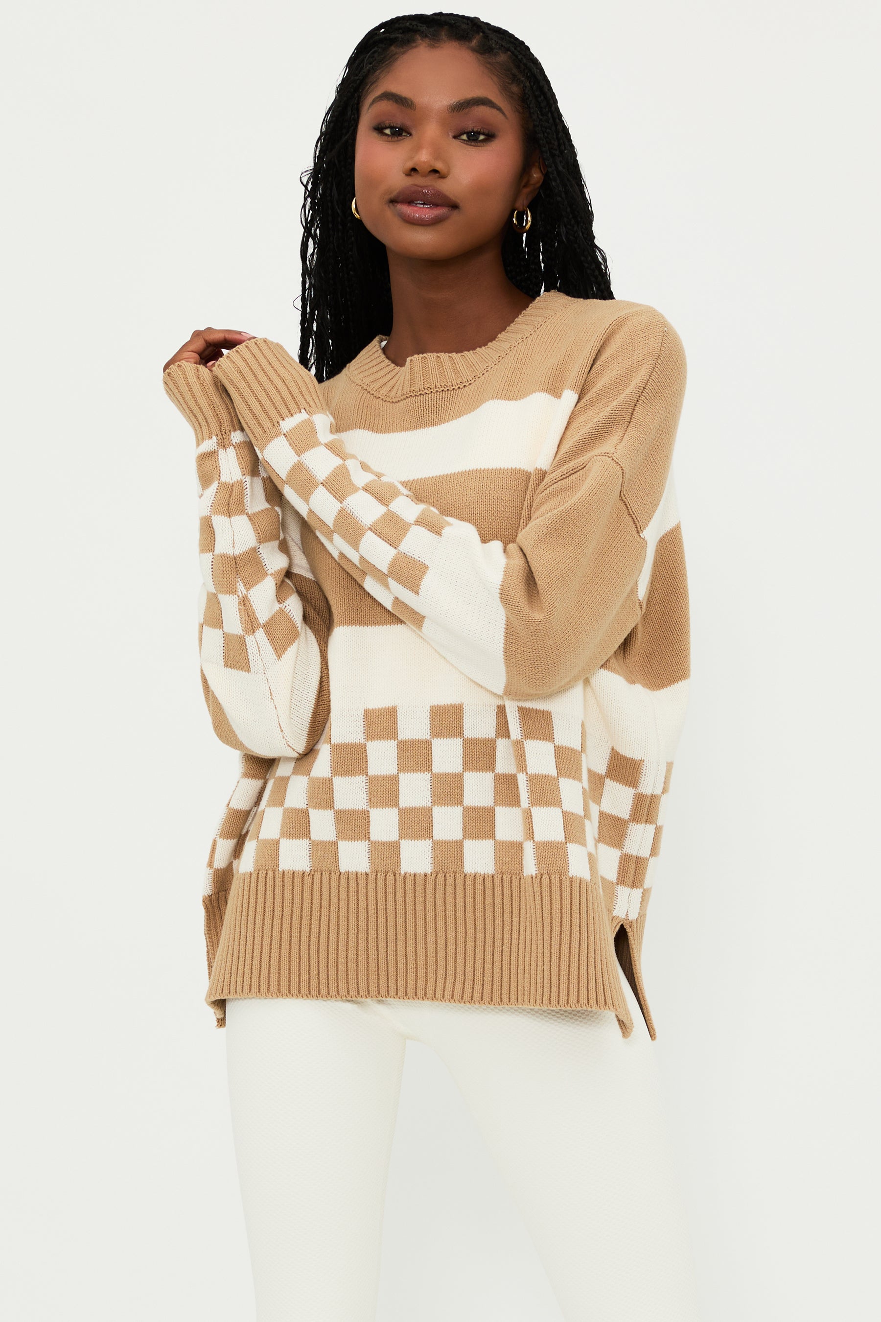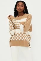 The Callie Sweater is our oversized crew-neck sweater, featuring a soft knit fabrication, ribbed knit trim, and a fun checkered print in taupe and white. This cozy sweater is perfect for throwing on after a beach trip and paired with your favorite pair of jeans.