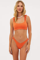 The Effie Top features a flattering scoop neckline with wide supportive straps that have a scrunch detail. In our new Sunshine Haze Scrunch fabric that has a textured feel with sparkly flecks throughout. Pair with the matching Phoebe Bottom in Sunshine Haze Scrunch.