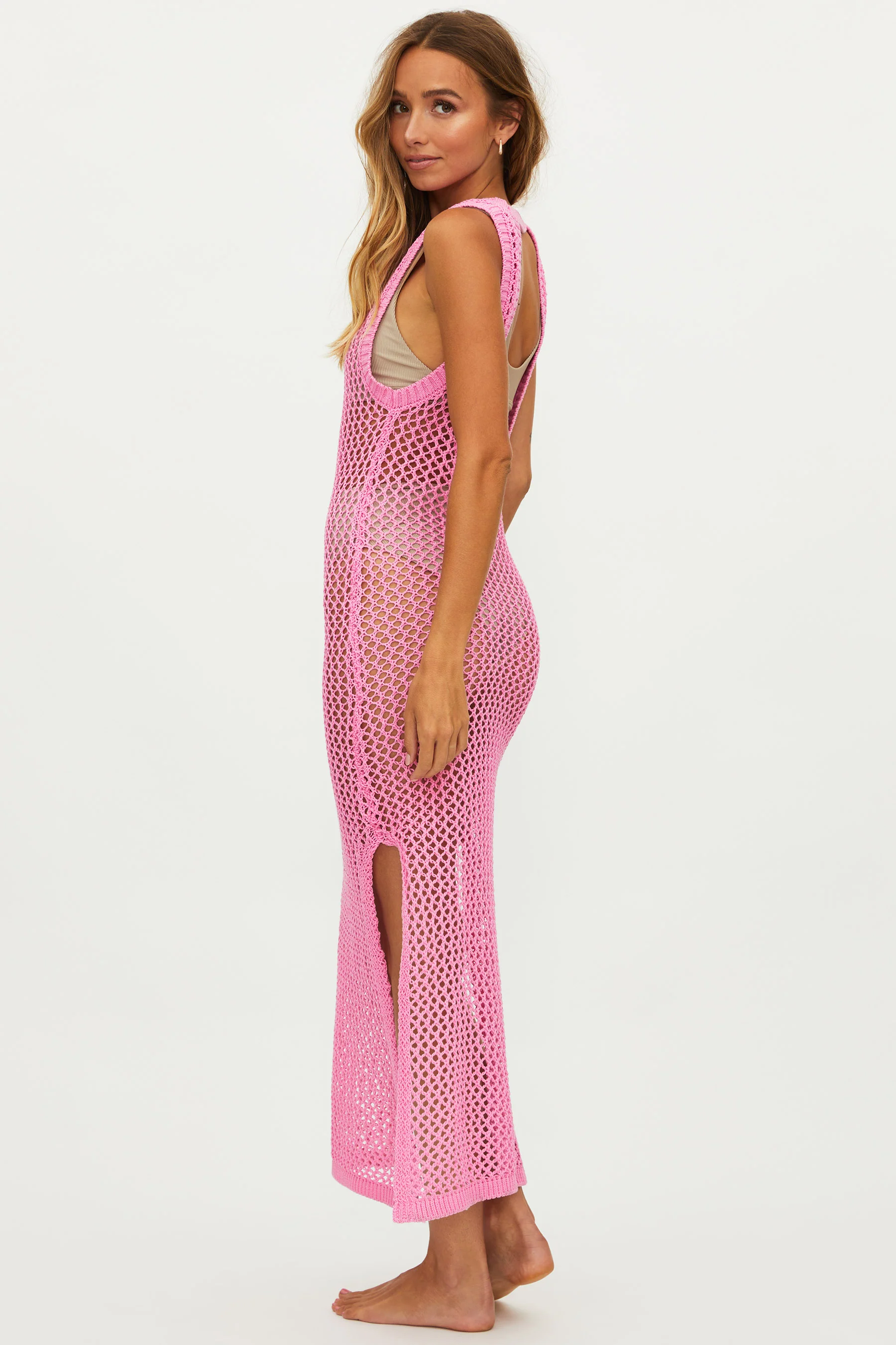 The Holly Dress is our new open knit crochet fabric cover up with a slit on both sides and an open back detail. Undergarments not included.