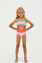 Our best selling Eva and Emmy now available in kids sizing. Match your mini in this fun colorblocked ribbed swim set.
