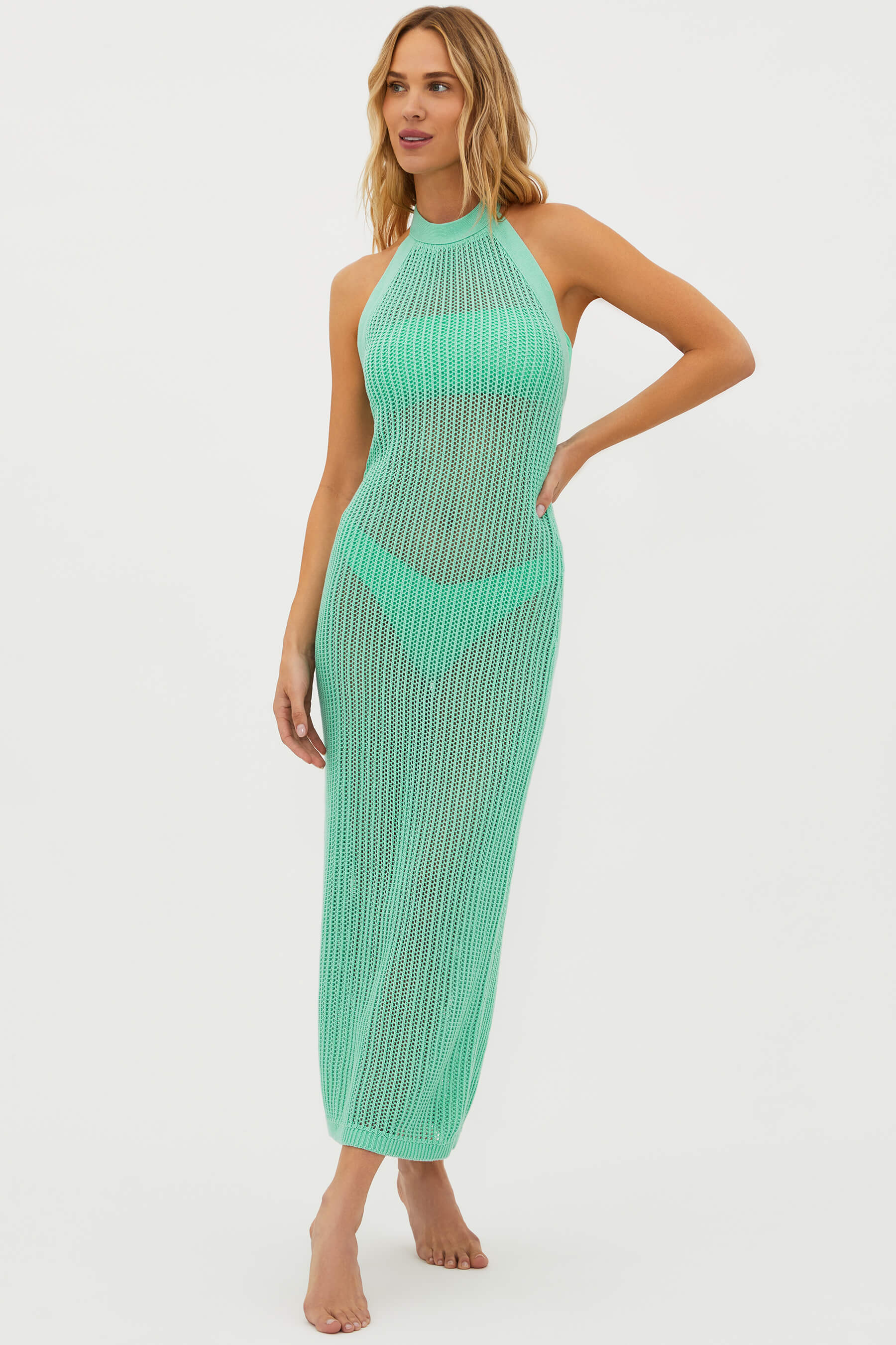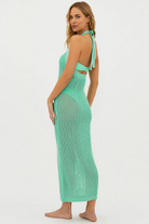 The Romee Dress is the perfect maxi dress for your next vacation. This crochet coverup dress has a high halter style neck that ties and a low open-back silhouette. Perfect thrown over the Kelsey Top and Vanessa Bottom in High Tide.