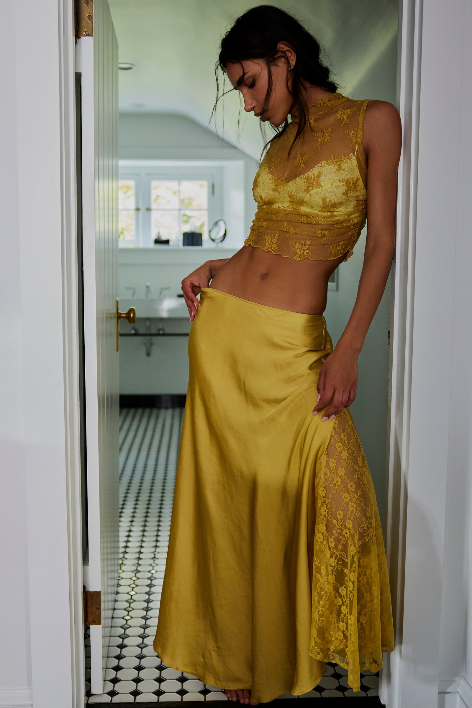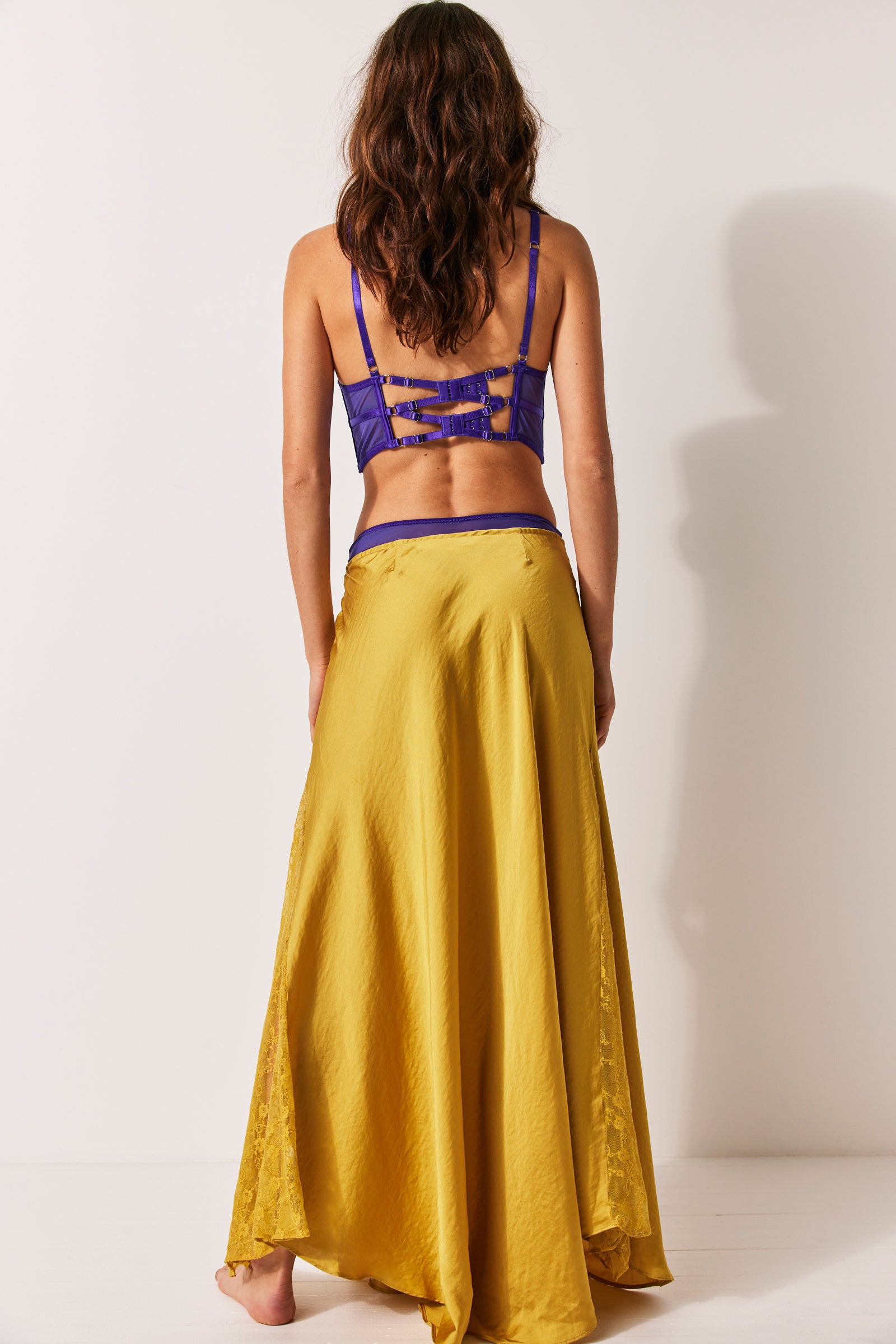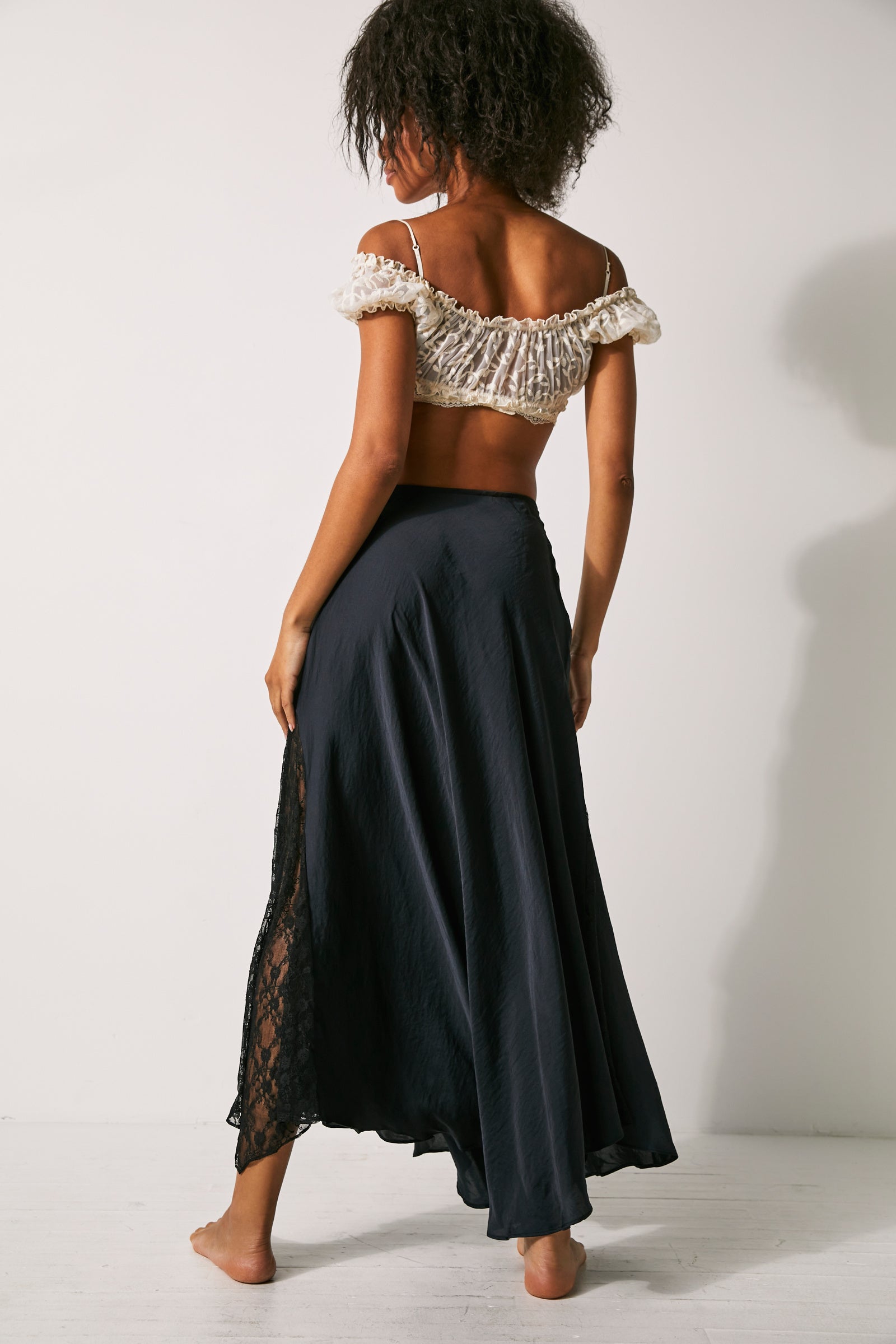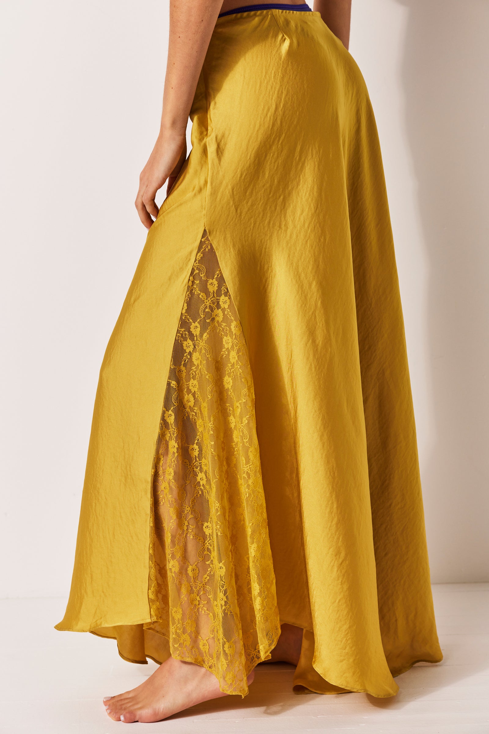 Features: Soft satin fabrication, elastic waistband, lace paneling at sides, godet pleating for added dimension, flowy silhouette