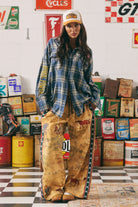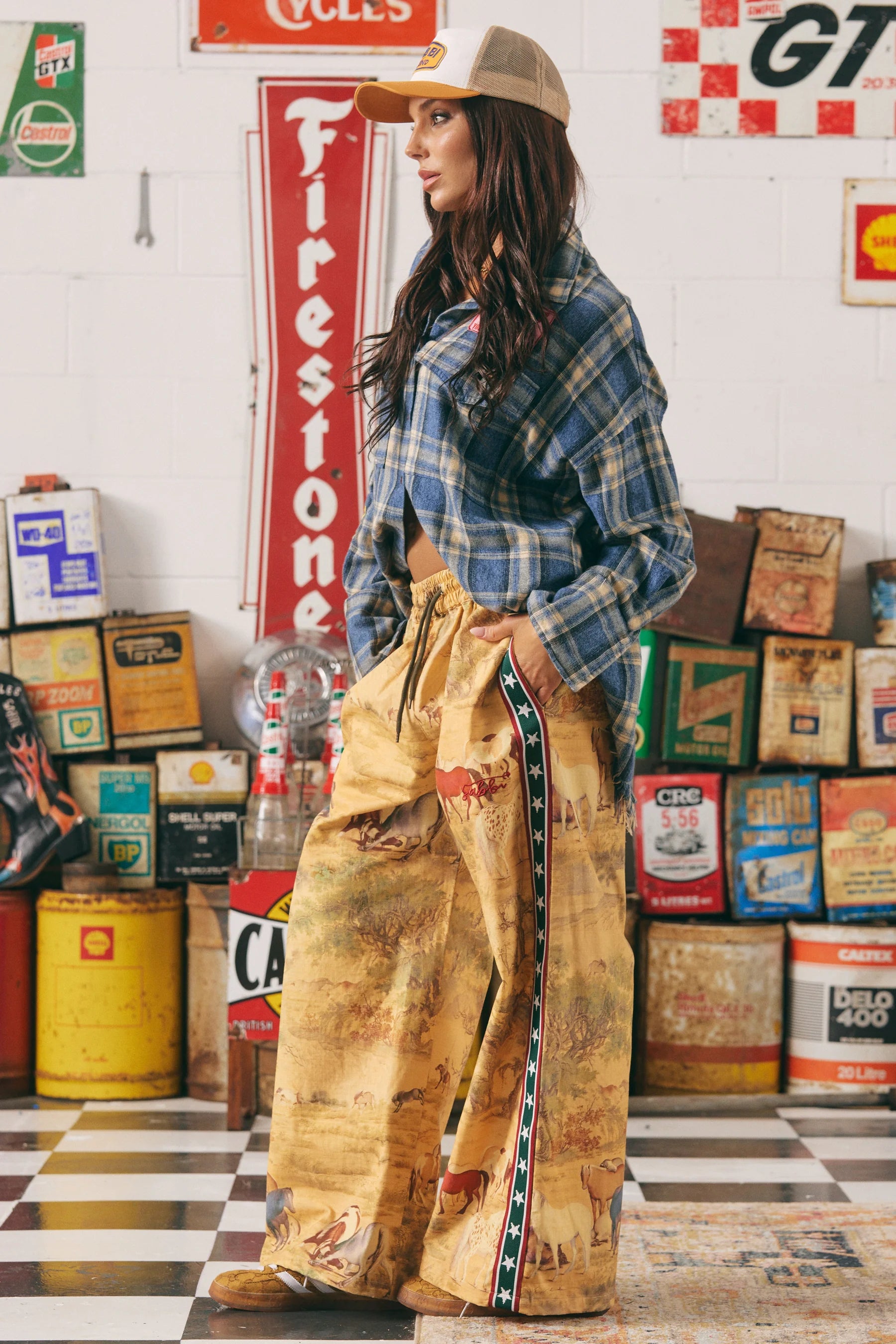 Meet the Raving Stars Neigh Queen Pants – where vintage rodeo dreams collide with bold streetwear vibes. Made from sturdy 100% cotton canvas drill, these wide-leg stunners feature an all-over horse and desert print that’s straight out of a dusty cowboy daydream. Star-studded taping runs down both legs, finished with our signature SABBI embroidery, because subtle was never the plan.