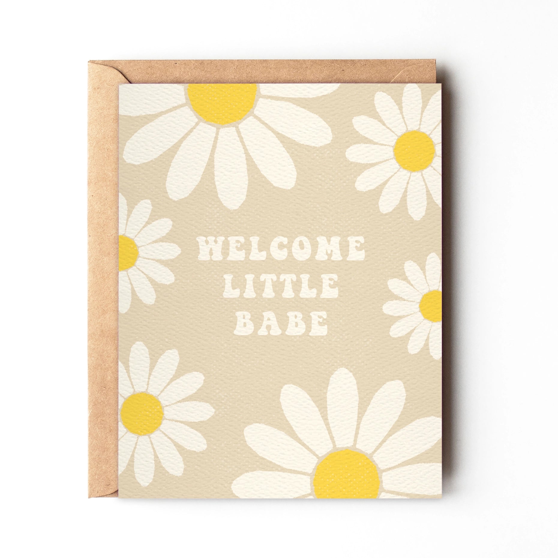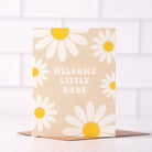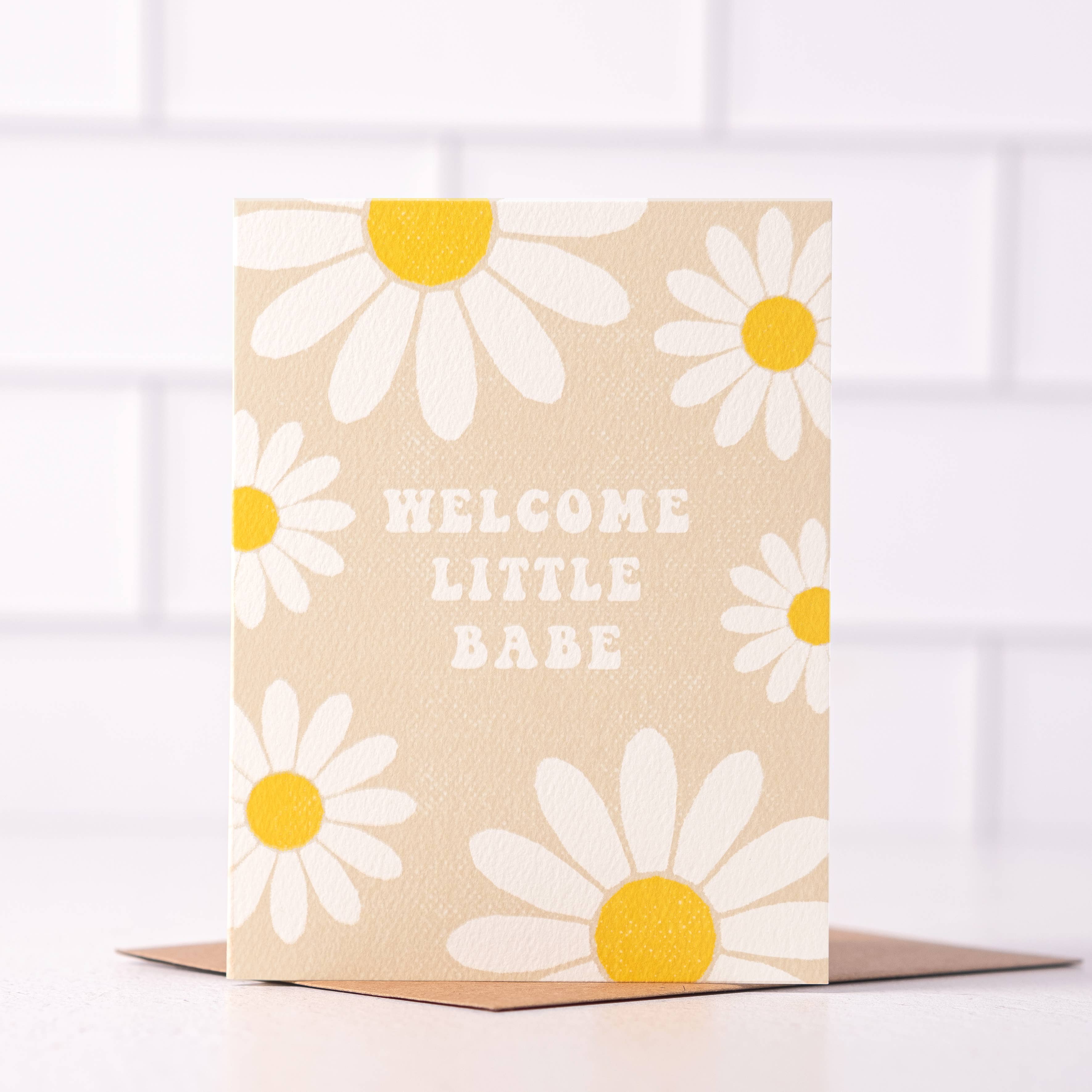 A sweet new baby card with hippie flower art. Featuring cheerful daisies and bold lettering, this card is the perfect way to welcome a little one with a touch of retro charm.