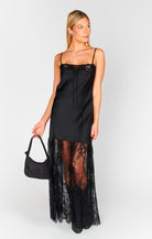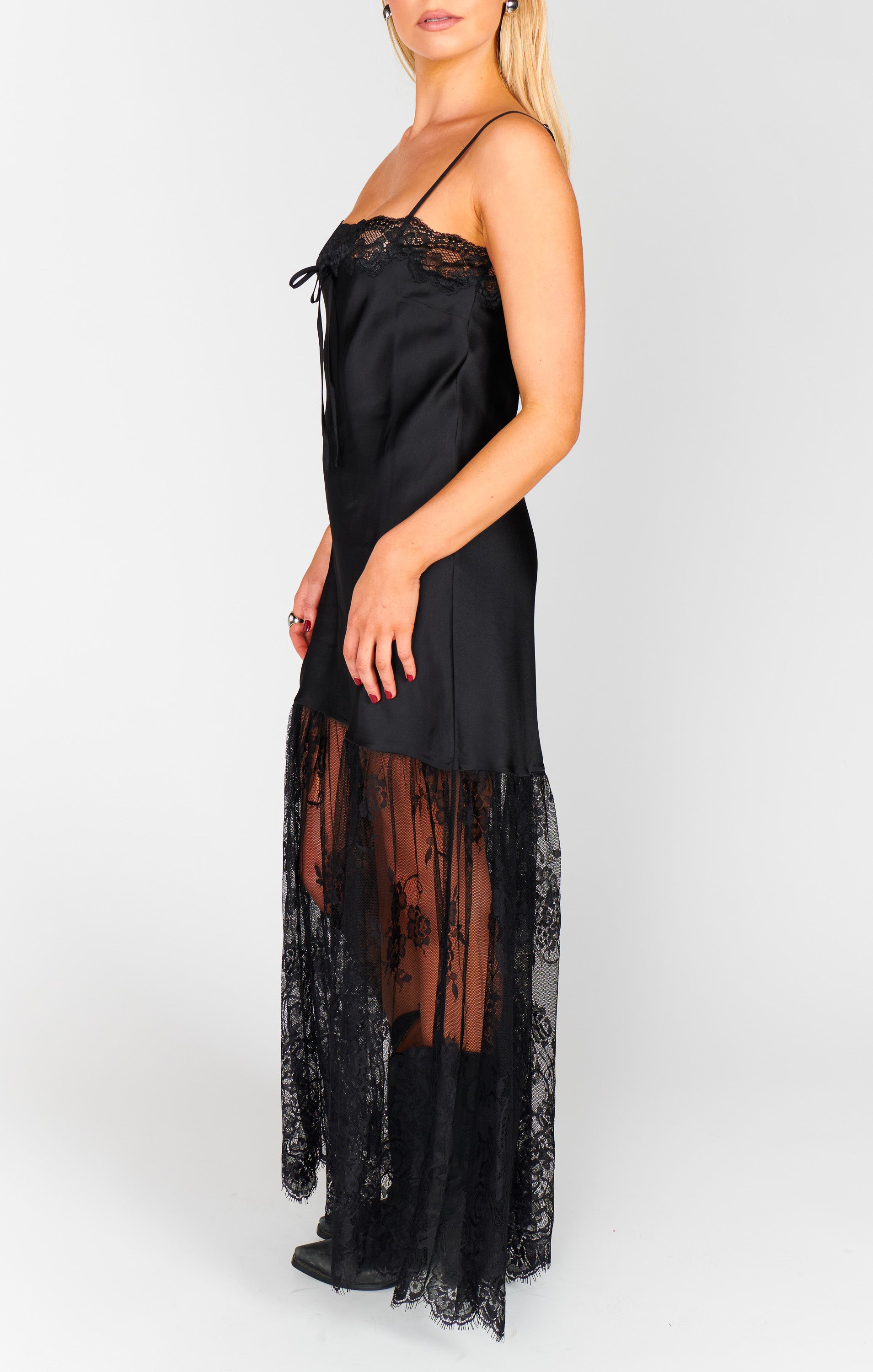 The Celine is not your average LBD. With luxe satin, delicate lace paneling, and a high-low sheer skirt that floats like a whisper, this maxi turns every sidewalk into a runway. The lace bustline adds a sultry vintage edge, while barely-there straps keep it effortlessly modern.
