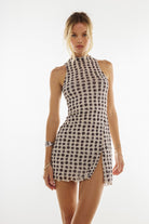 Get ready to turn heads in the Savannah Mini! This playful mock neck sleeveless dress is perfect for any occasion. With a flirty slit, this mini dress adds just the right amount of sass to your outfit. So go ahead, make a statement and have a little fun!