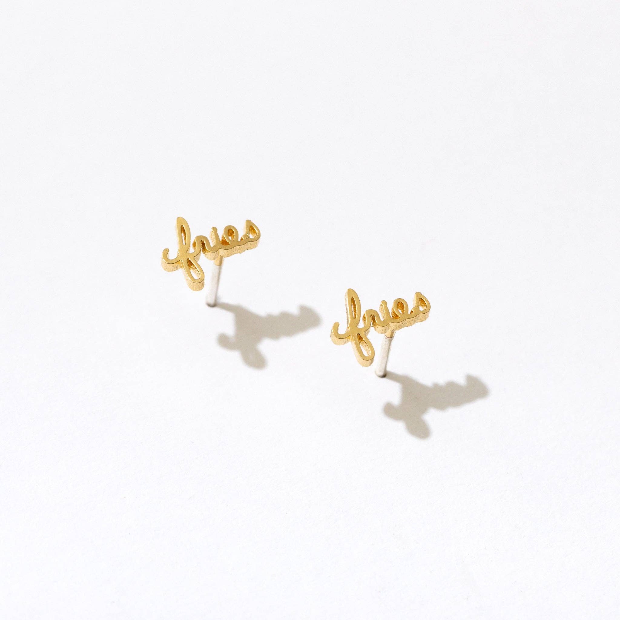 Feeling salty? You can't buy happiness, but you can buy French fries - and that's pretty close. Taters gonna tate! These Fries Stud Earrings are 14k gold plated brass and are perfect for any potato fan. The sterling silver post is great for any spud. Bless your lucky starch! Script measures 8 x 6mm.
