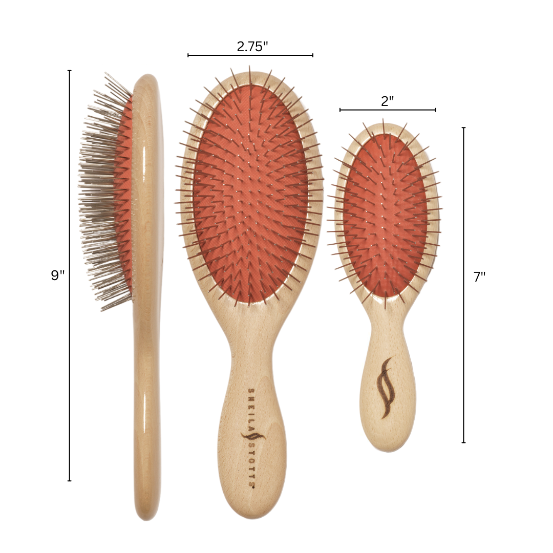 A solid maple wood version of our Original Untangle Brush. The signature Sheila Stotts Untangle Wood Large and Untangle Wood Small Brush has a solid maple wood handle that is comfortable to grasp while the tough yet gentle metal bristles are anything but when it comes to detangling hair and massaging the scalp. The small size is great for teaching children how to brush their own hair. With the smaller size the handle fits perfectly in their little hands. It is also just the right size for tossing in a purse or travel bag to brush on the go.
