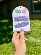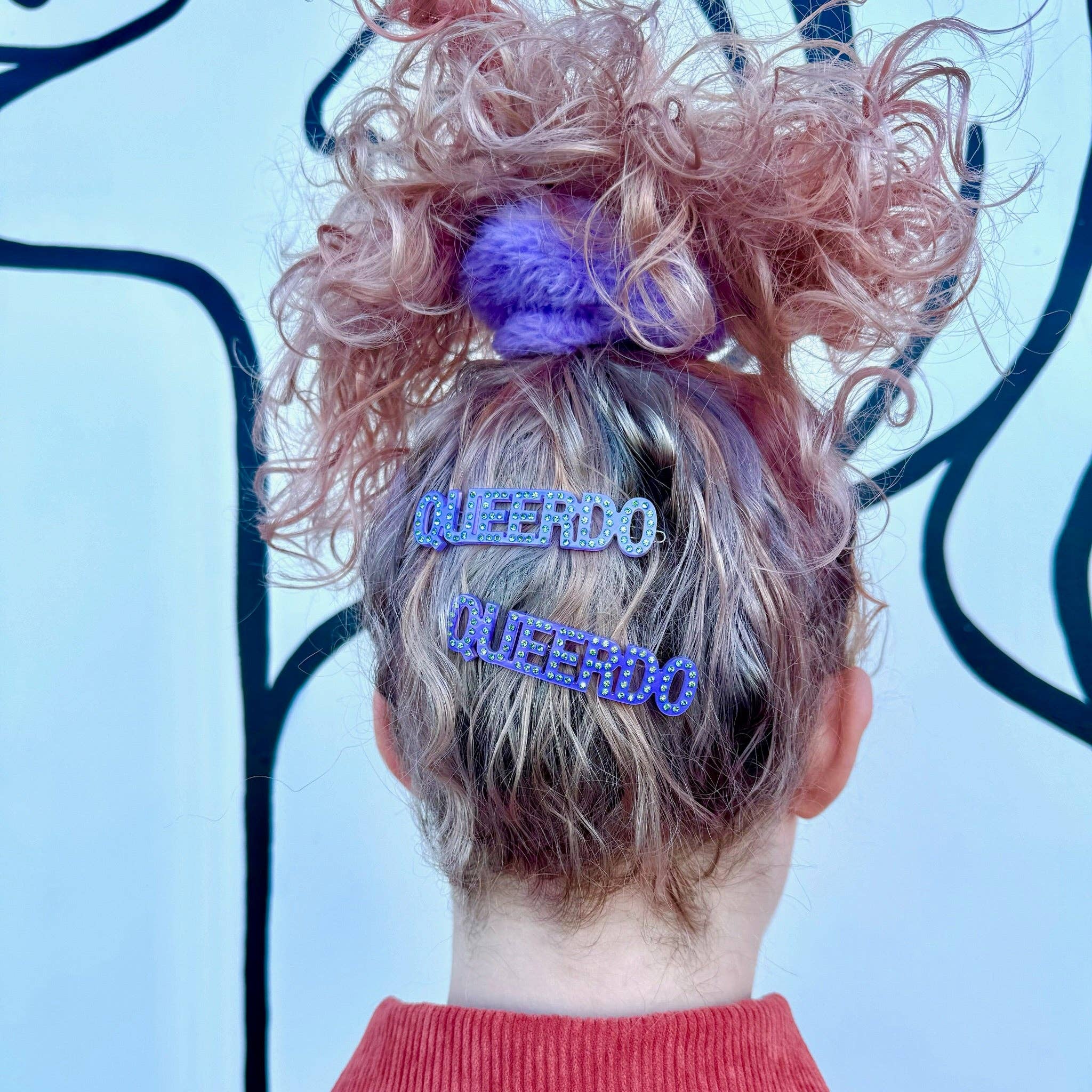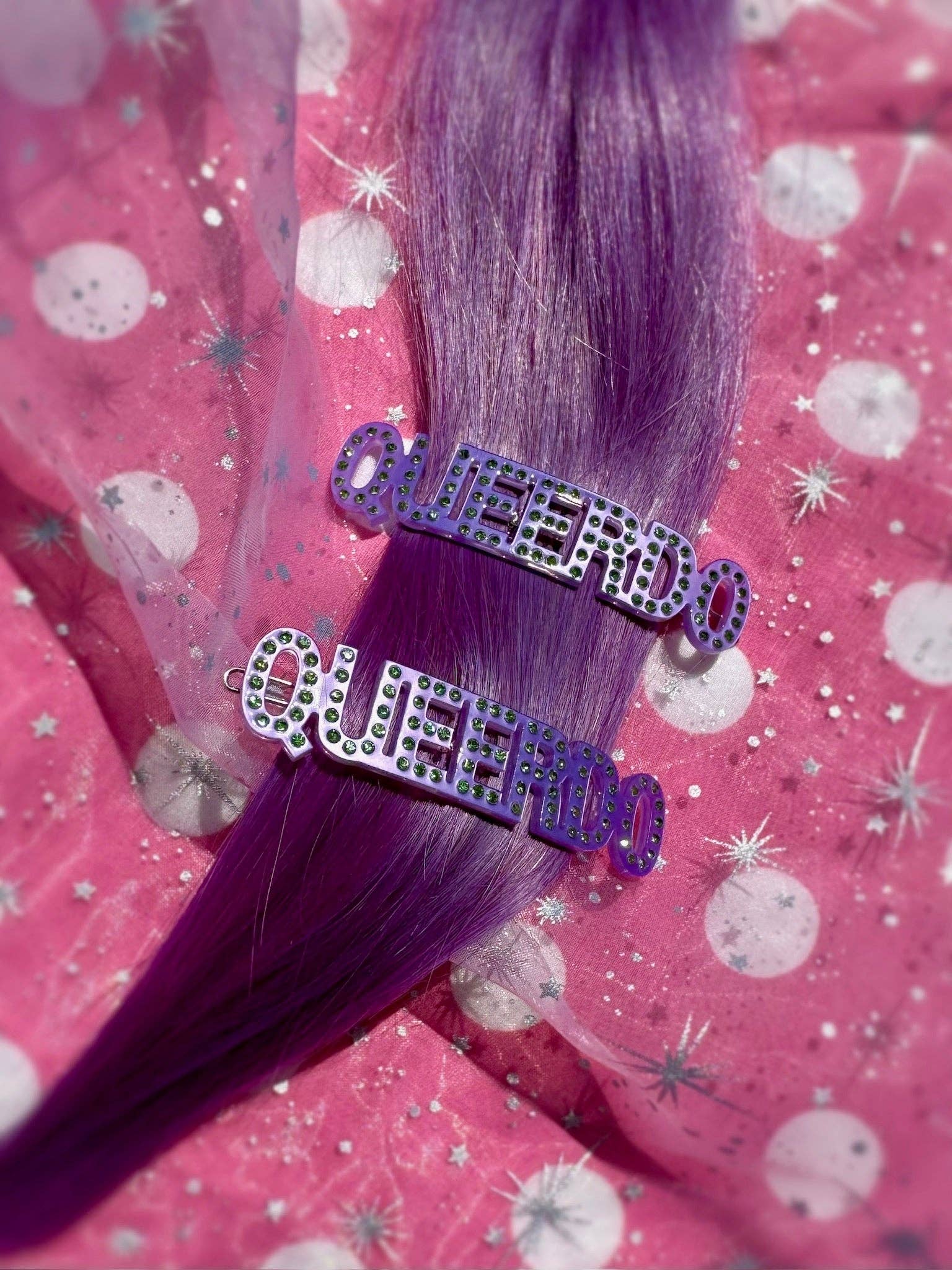 Each set includes two (2) hair clips. Hair clips are purple with green gems spelling out "queerdo".
