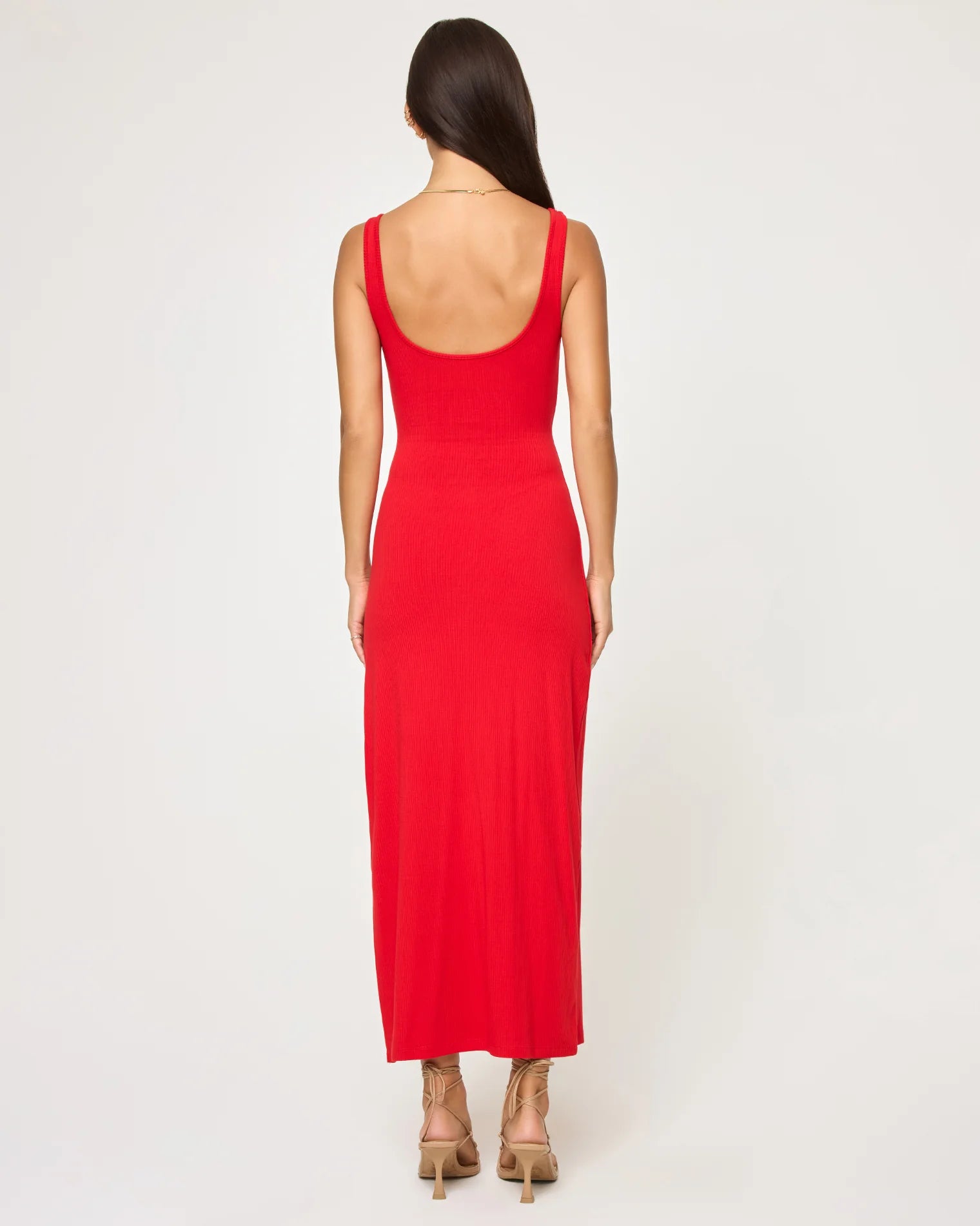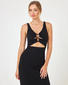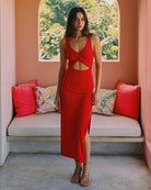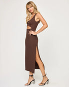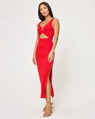 All eyes on Camille. This fitted rib knit midi hugs just right, with a scoop neckline, thick straps, and playful loop cutout detailing at the waist. Finished with a side slit for movement, it’s the kind of dress that brings the drama without the effort.