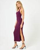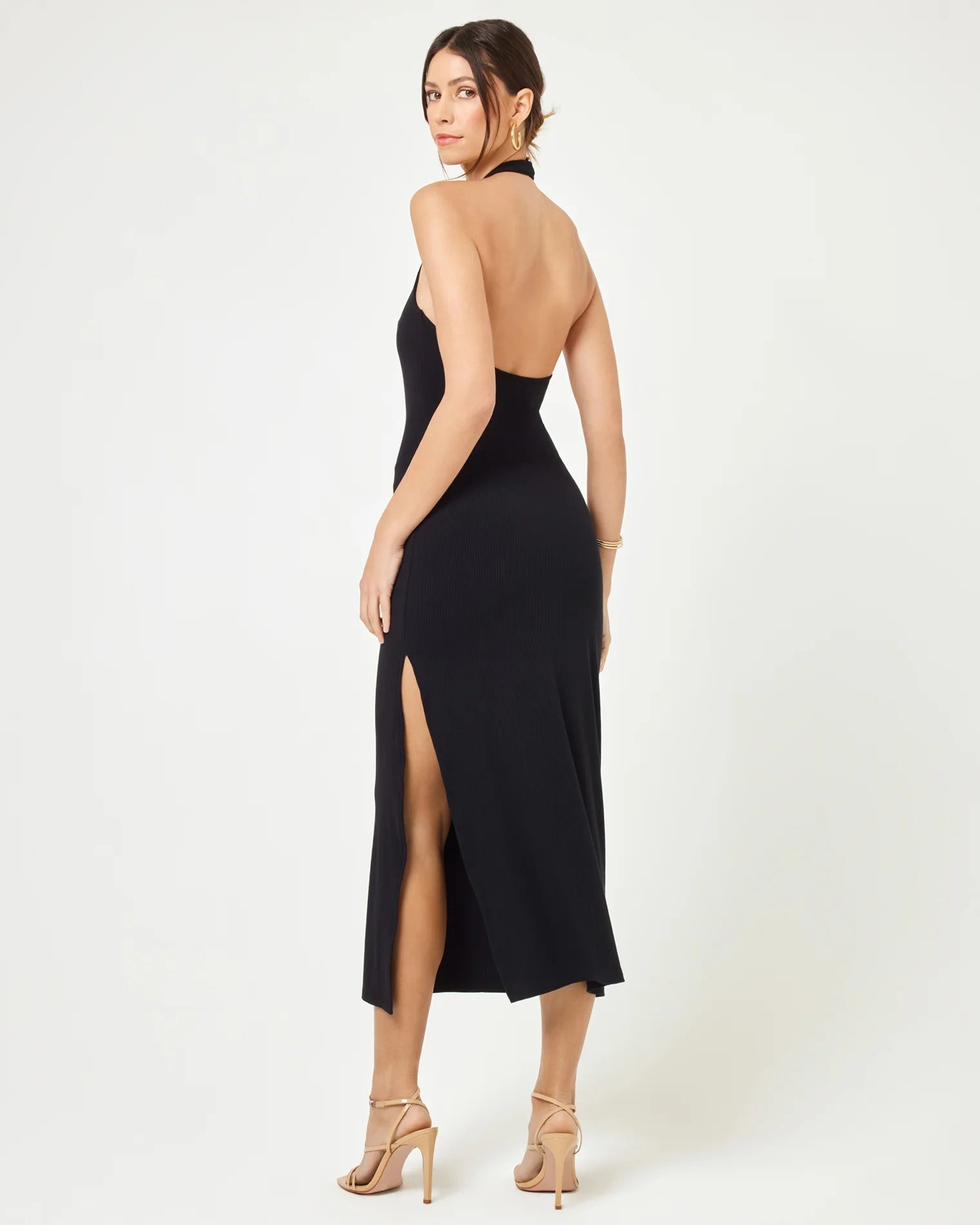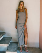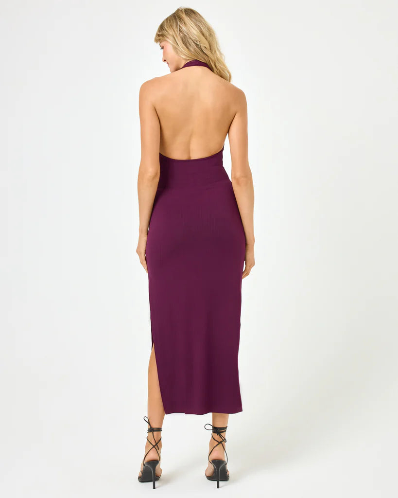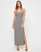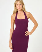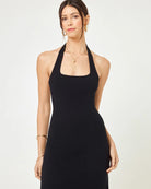 We're hot, hot, HOT for halter tops. So much so that we made her into a dress. The London is an ankle-length fitted ribbed frock with a rounded square neckline and open back.