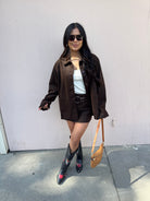 Meet your new go-to layer: the Brooklyn Faux Leather Jacket. With its structured silhouette, oversized patch pockets, and smooth button-down design, this piece is equal parts polished and edgy. The soft faux leather finish adds a luxe touch while staying easy to wear and style.