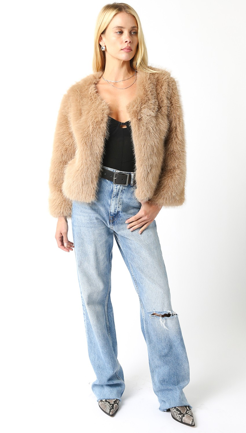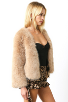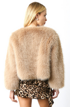 Get ready to turn heads at your next holiday party with our taupe faux fur jacket! Its luxurious faux fur will keep you warm and stylish all night long. Perfect for adding a touch of glamour to any outfit.