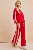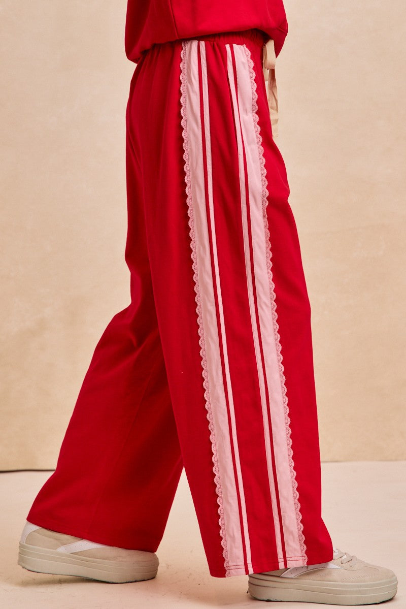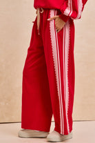Your lounge game just leveled up. The Lacey Lane Sweats feature a high-rise fit, wide-leg silhouette, and standout ribbon striping that runs the full length of each leg. Comfortable, bold, and unbelievably cute, these pants make it easy to go from couch mode to “out the door” without changing a thing.
