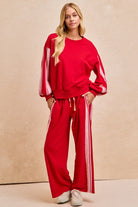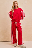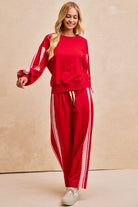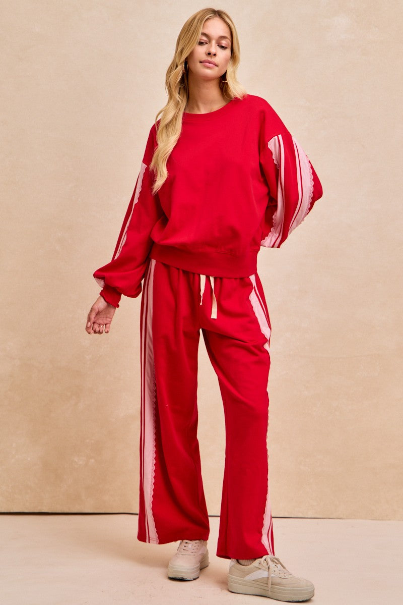 Meet the top half of your new favorite set—the Lacey Lane Sweatshirt. Designed in a vibrant, candy-apple red, this relaxed-fit pullover is finished with playful ribbon-striped sleeves that bring a little retro varsity charm to your everyday look. Soft, breathable, and easy to style, it’s the statement sweatshirt that still feels like a cozy classic.