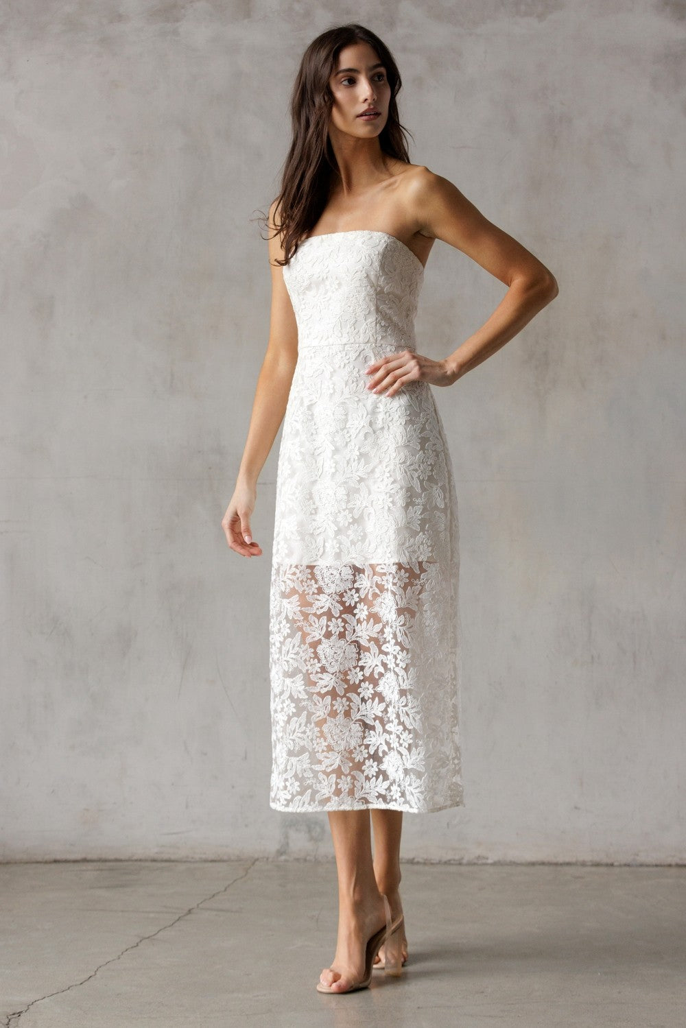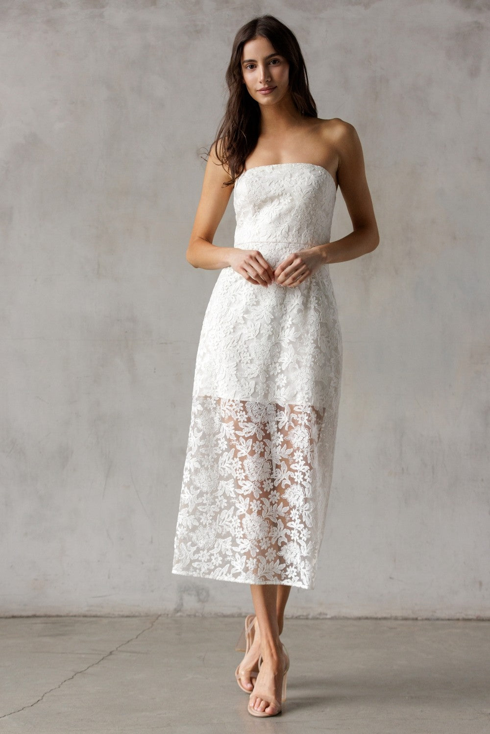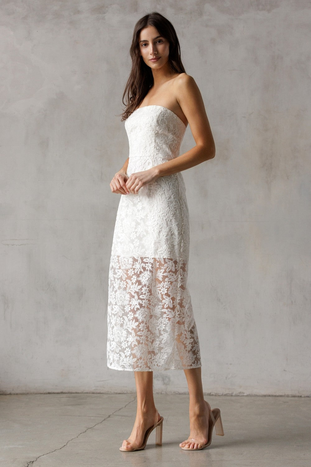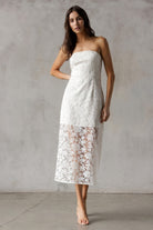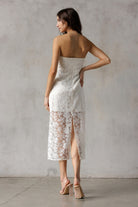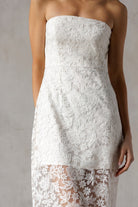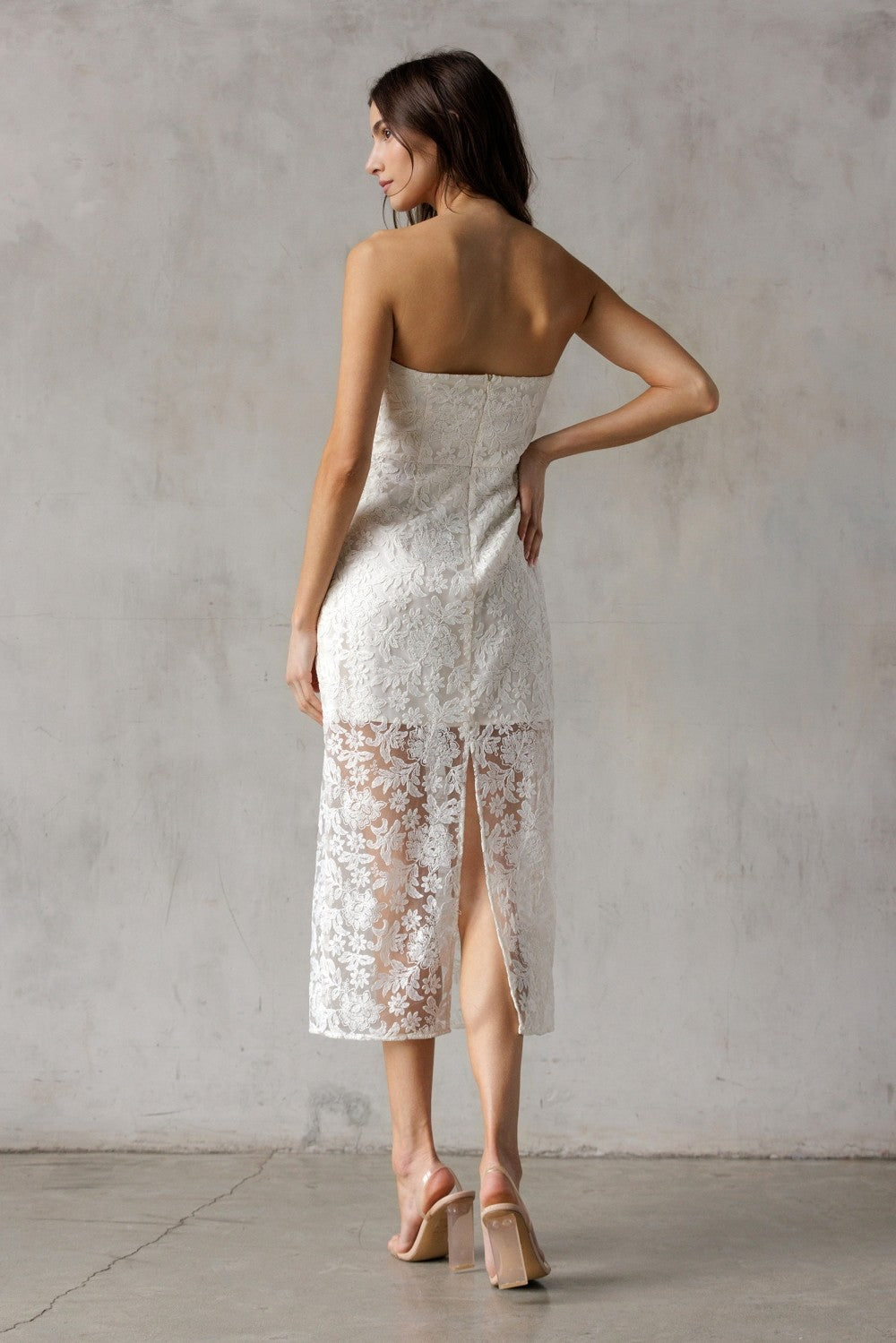 Turn heads in the Lilian Lace Midi Dress, a romantic yet sultry piece designed to make you feel effortlessly chic. Featuring delicate floral lace embroidery and a sheer lace panel from mid-thigh to hem, this strapless beauty hugs your curves in all the right places. A back slit adds just the right amount of movement, making it perfect for bridal showers, formal events, or a modern bridal look. Finished with an invisible zipper for a sleek, seamless fit, this dress is the definition of timeless sophistication!
