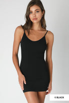 A ribbed knit, one size fits most midi dress featuring a round neckline and back, sleeveless construction and a bodycon silhouette.