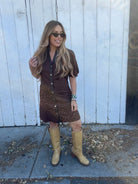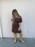 Soft suede texture meets sleek leather accents in the Vienna Faux Suede Dress. Designed with puff sleeves, a flattering V-neckline, and gold button-front closure, this piece blends vintage charm with a polished, modern feel. Perfectly structured yet easy to wear, it’s a one-and-done outfit that makes a statement.
