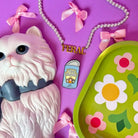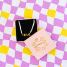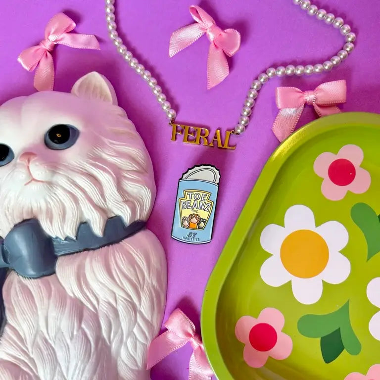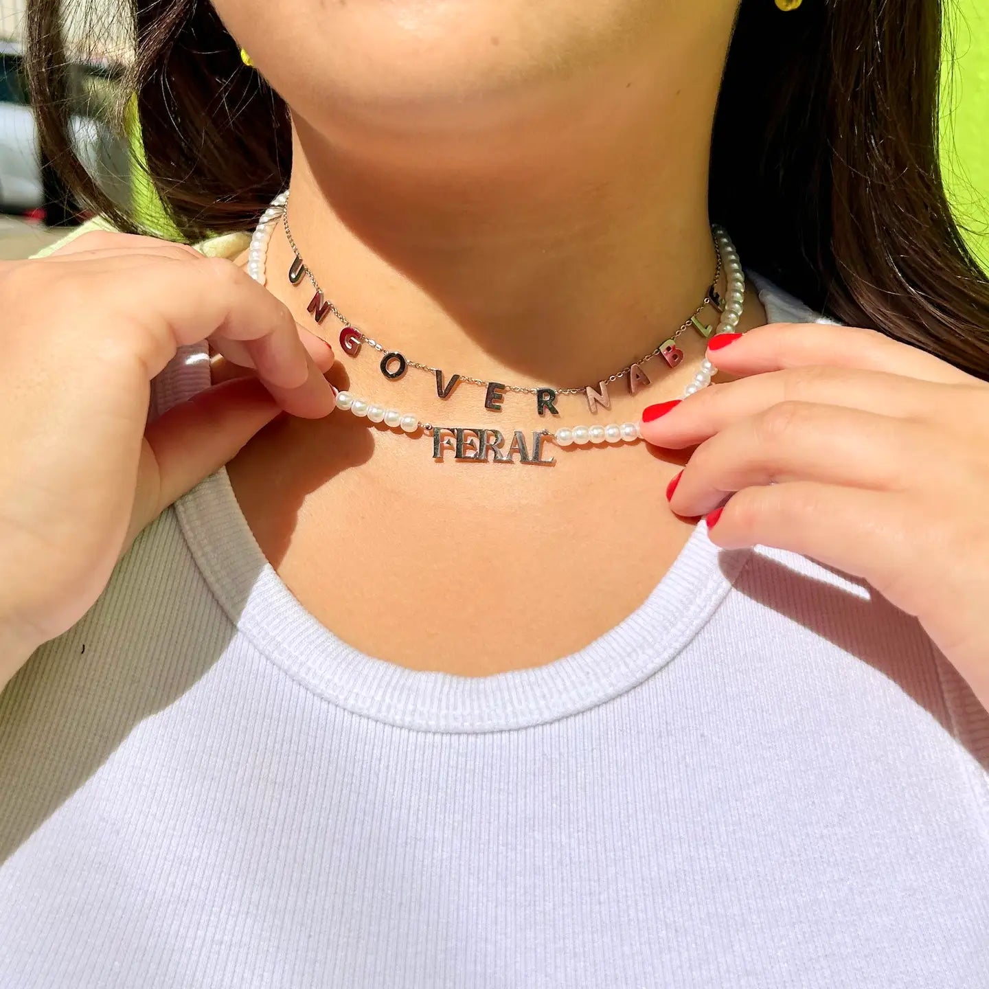 Necklace measures 16-18 inches and features faux pearls and a stainless steel nameplate with 18k gold plating and reads "FERAL" in all caps