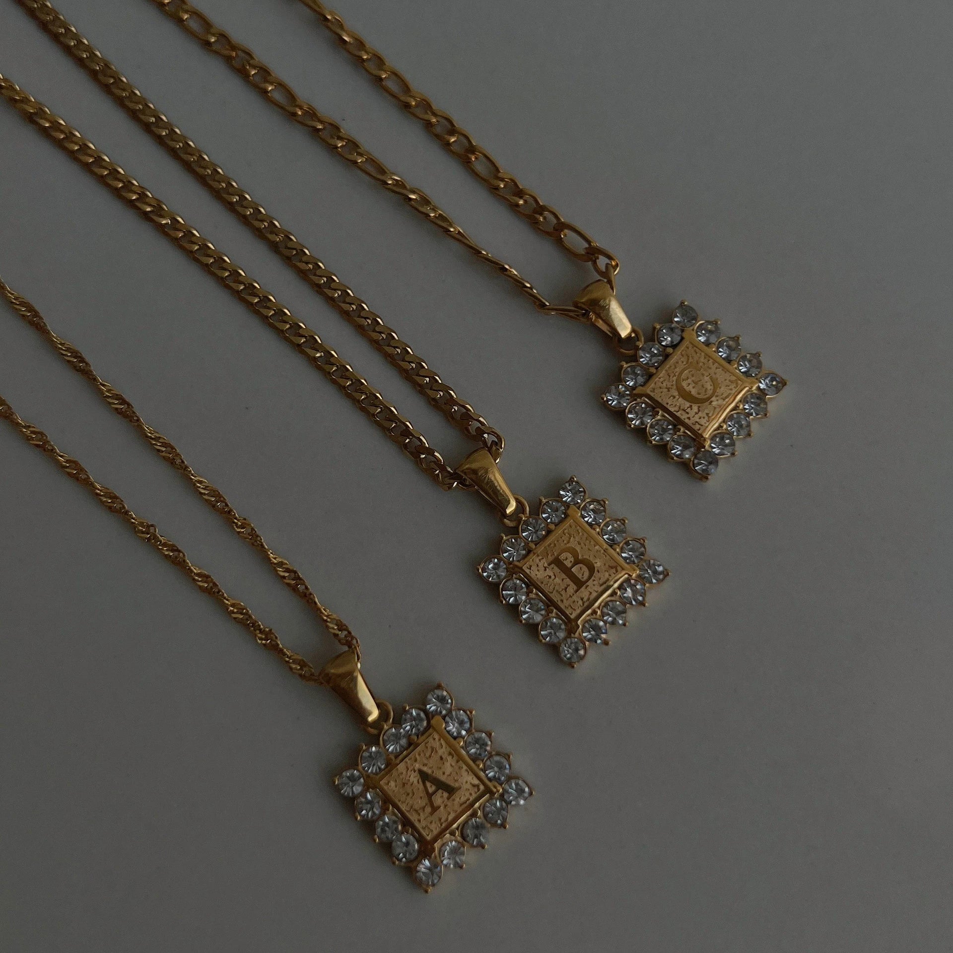 This bold and stylish necklace features a stunning gold chain and initial pendant surrounded by shimmering rhinestones. This is a unique take on the initial necklace, adding some sparkle and personality to any outfit. Wear it alone as a statement piece or layered with your favorite chains.
