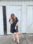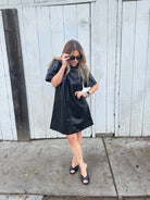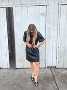 Elevated edge meets everyday ease in the Aria Faux Leather Dress. Crafted in a sleek black finish with a soft inner lining, this dress brings modern polish with a comfortable fit you’ll actually want to wear. The puffed short sleeves and subtle seam details add dimension, while a keyhole back closure keeps the look effortlessly refined. Side pockets give it that perfect blend of fashion and function, making it as practical as it is chic.