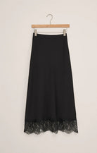 Crafted from smooth, lustrous satin, this high-rise midi skirt brings an elevated touch with a scalloped lace hem. The pull-on silhouette offers comfort and polish in equal measure, perfect for holiday dinners, cocktail hours, and everything in between.