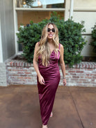 Make an entrance in this stunning satin stunner, designed to turn heads from every angle. With its plunging neckline, figure-skimming silhouette, and dramatic oversized bow at the back, this dress brings the perfect mix of elegance and playful edge.