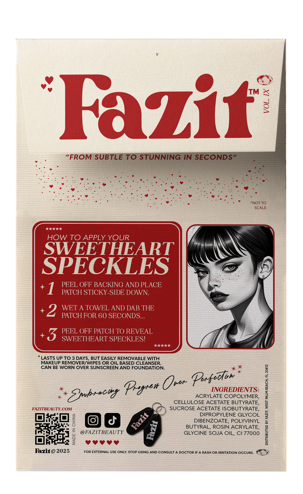 Level up your glam game in seconds with Fazit Makeup Patches™! The Sweetheart Speckles edition gives you instant glitter freckles in a heart-speckled design that’s subtle, playful, and oh-so stunning. Perfect for festivals, date nights, or when you want to add a little sparkle to your everyday look—no messy glitter required.