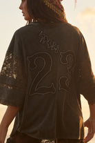 Cut in an oversized, slouchy silhouette, it features delicate lace sleeve detailing that adds a soft, romantic contrast to the bold graphic artwork. The washed cotton body gives it that lived-in, vintage feel, while the lace panels bring texture, movement and an unexpected feminine edge.