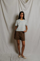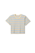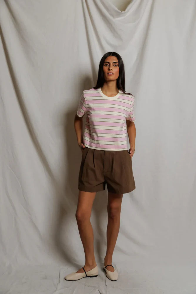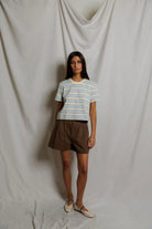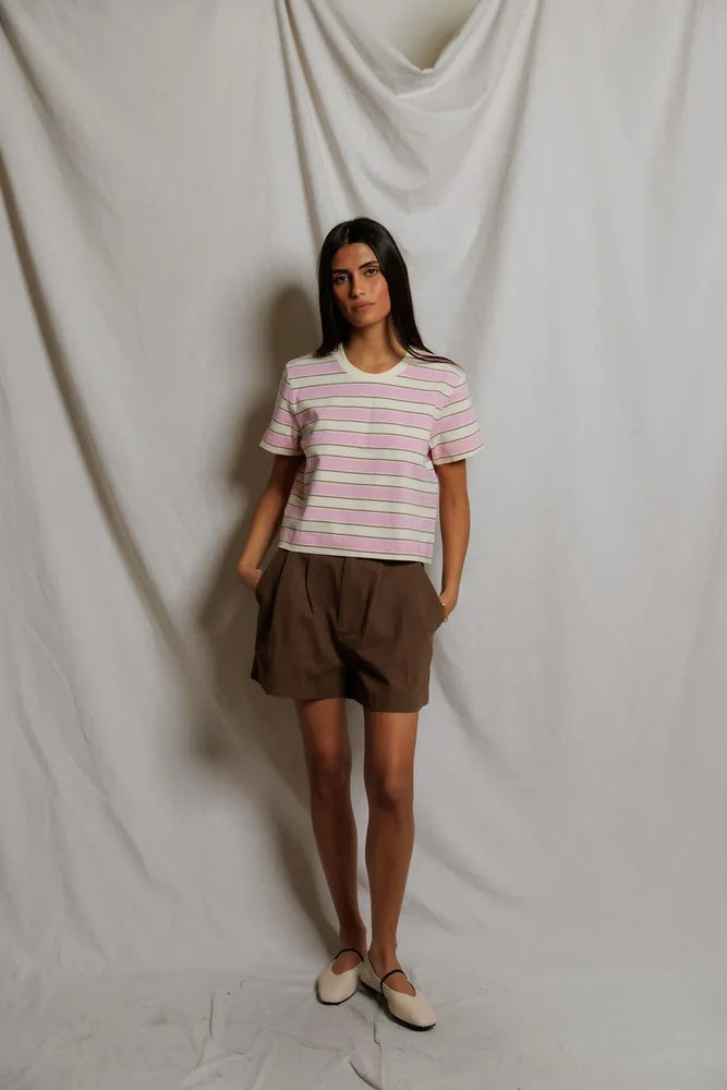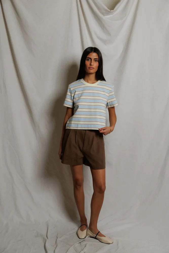the gia is the tee sister to our favorite daria rugby. made from the same structured cotton knit, it trades the collar for a clean crew neck and swaps the long sleeves for a classic short sleeve. it features the same bold, vintage-inspired stripes and an easy, slightly cropped silhouette that makes it an instant go-to for warmer days.