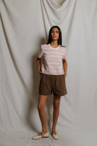 why we love it: it’s the perfect way to wear the rugby trend when you want something a bit lighter. we love the graphic impact of the stripes paired with the simplicity of a perfect crew tee. it feels nostalgic but completely fresh, especially when paired with pants like the pia pant.
