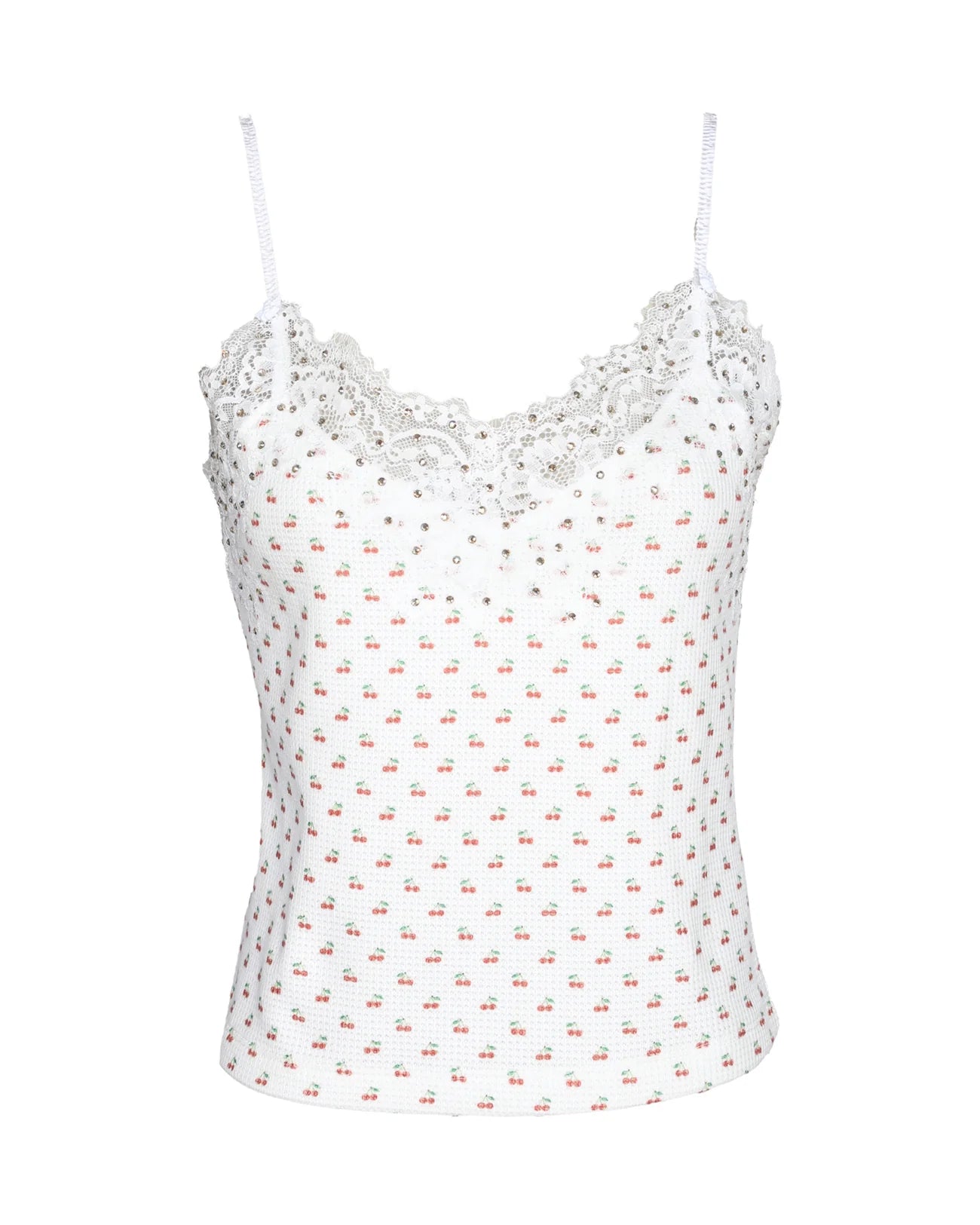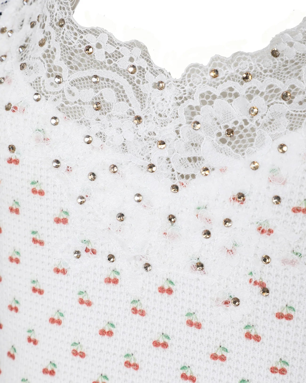 Sweet with a playful twist, the Know How to Pick 'Em Lacie Tank features a soft white thermal fabric with an allover cherry print. Delicate lace trim frames the neckline, finished with subtle rhinestones for a touch of shine.