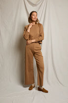 description: the mikos is a wide-leg pant designed with a clean silhouette and a sporty contrast stripe running down the side for a classic touch. crafted from a smooth travel knit that never wrinkles, it offers the comfort of your favorite lounge set while maintaining a polished look that’s ready for the airport or a long day out. pair it with the Nell sweatshirt for an easy travel set you can throw on without a thought.