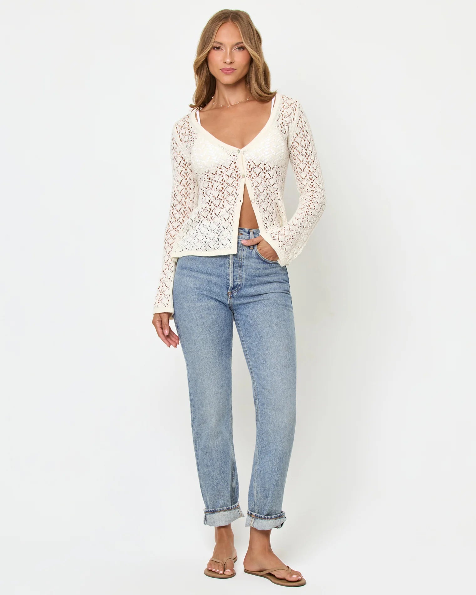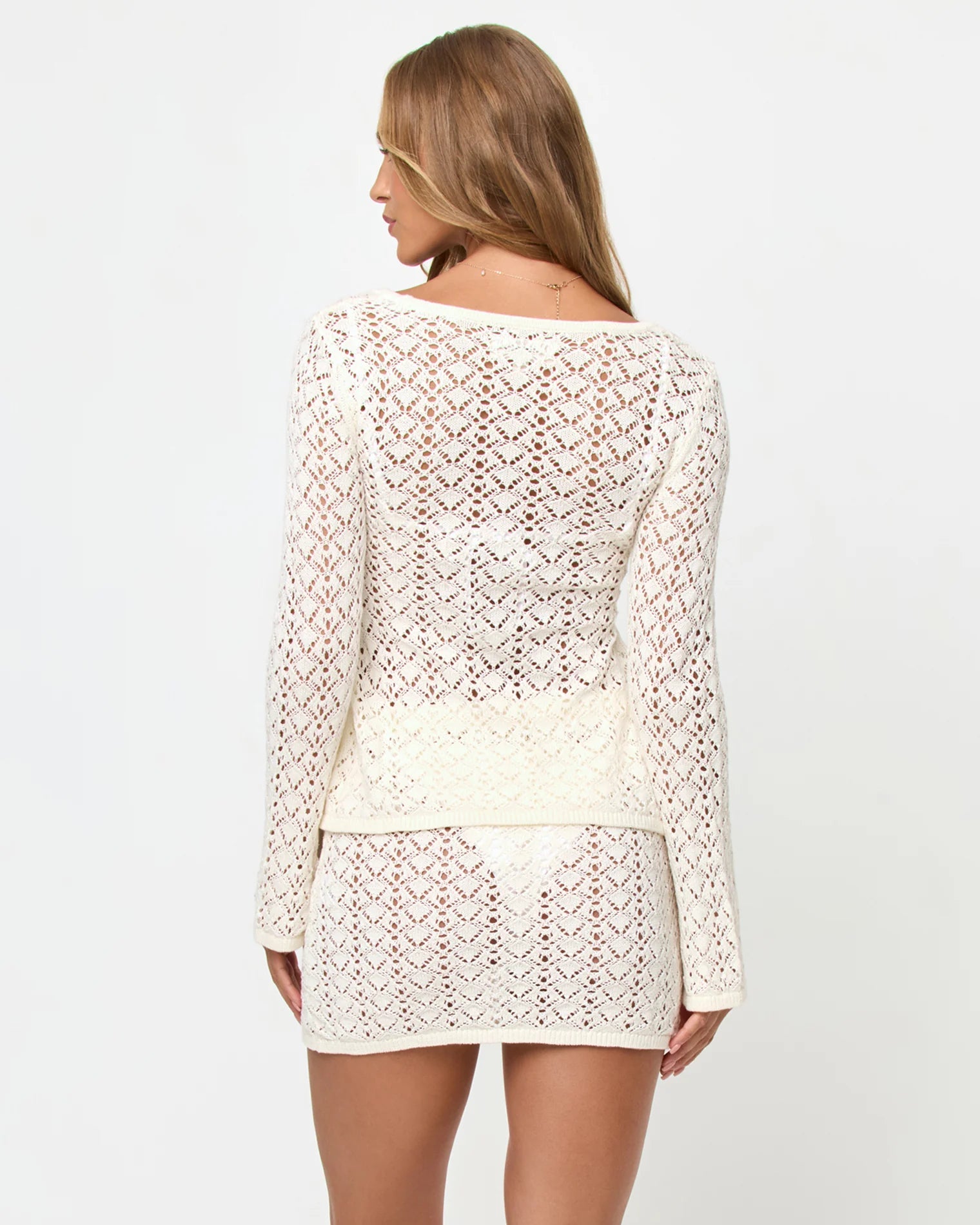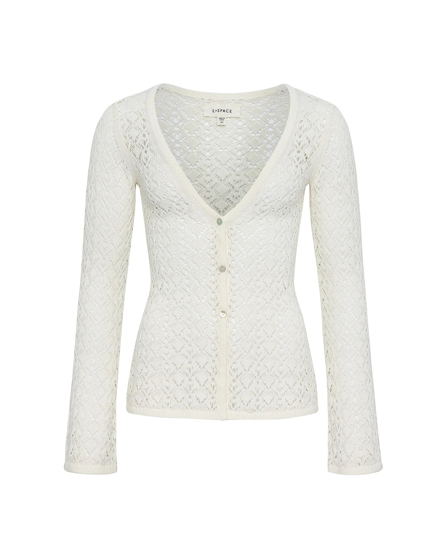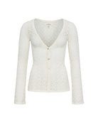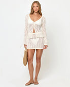 The Nova Top brings a romantic, bohemian elegance to your wardrobe. Its extended hemline and fluid bell sleeves create graceful movement, while the low V-neckline and button-front placket add refined structure. A front hem split opens the silhouette just enough to show some skin, balancing the fitted bodice with ease. Crafted from an unlined cream crochet knit, it brings a tactile, airy finish that feels both artisanal and modern. Pair it with tailored trousers or the matching mini skirt for an effortlessly sophisticated look.