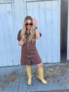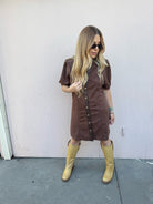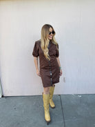 Soft suede texture meets sleek leather accents in the Vienna Faux Suede Dress. Designed with puff sleeves, a flattering V-neckline, and gold button-front closure, this piece blends vintage charm with a polished, modern feel. Perfectly structured yet easy to wear, it’s a one-and-done outfit that makes a statement.