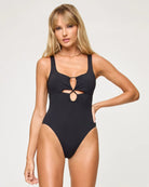 Get yourself a swimsuit that can do it all! Introducing the Bondi One Piece. This classic coverage cutie doubles as swimwear and a bodysuit so she can truly take you from day to night. Details include a shirred front complete with metal detailing, cutouts and wide straps. Who says you can't have it all?