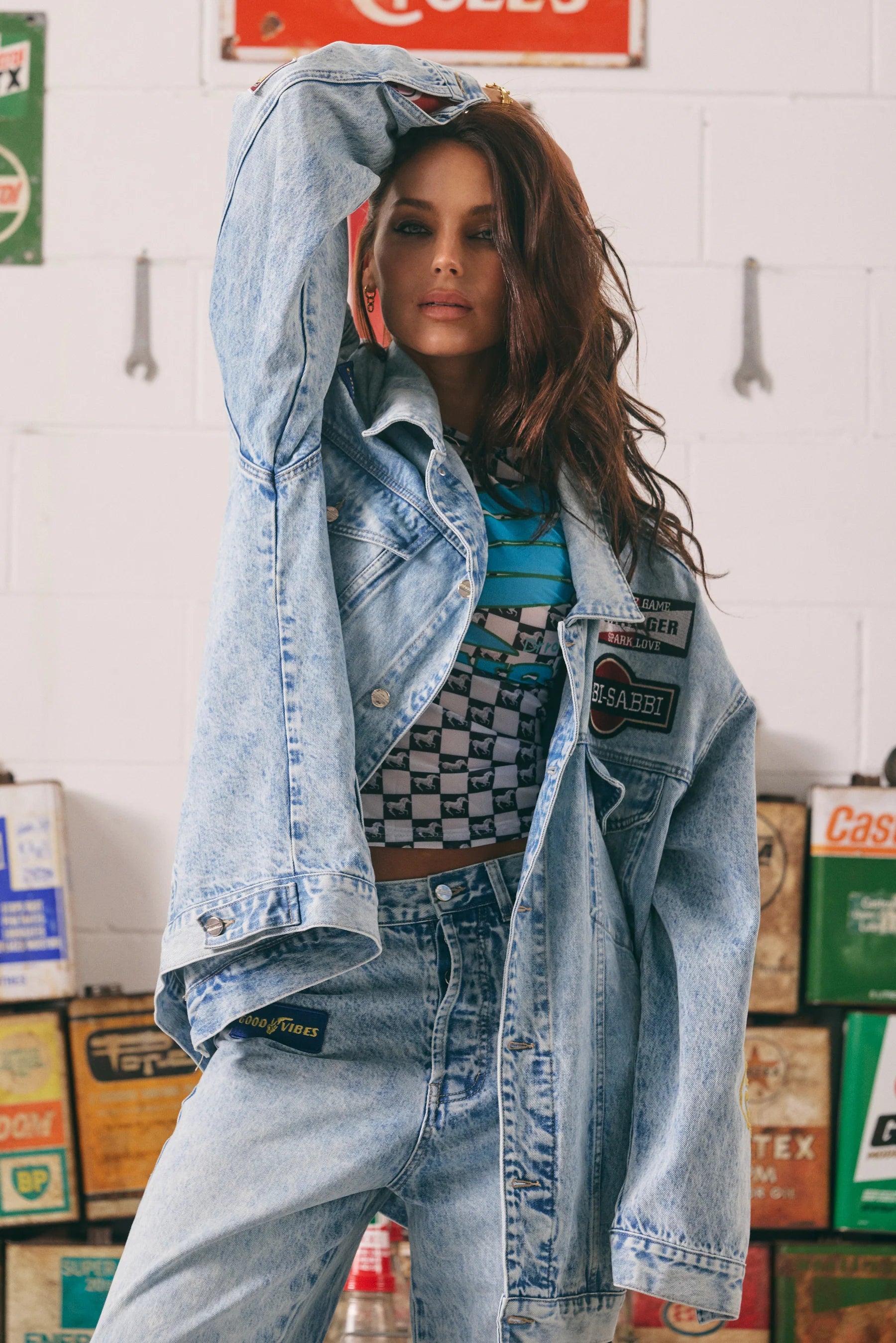 The Mermaid Racing Jacket is a heavyweight contender in the style game. Crafted from vintage-washed denim with a relaxed oversized fit, she’s all patched up with attitude, stitched with affirmations, and inked with racing soul. From the WABI-SABI badge to the embroidered “Good Vibes” badge and Sabbi crest artwork blazing across the back, this jacket has main character energy.