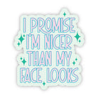 Make your presence felt with this I Promise I'm Nicer Than My Face Looks Sticker! Its crowd-pleasing design will have everyone smiling and remind them that you can be soft and friendly even when you look tough!