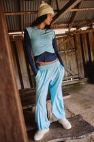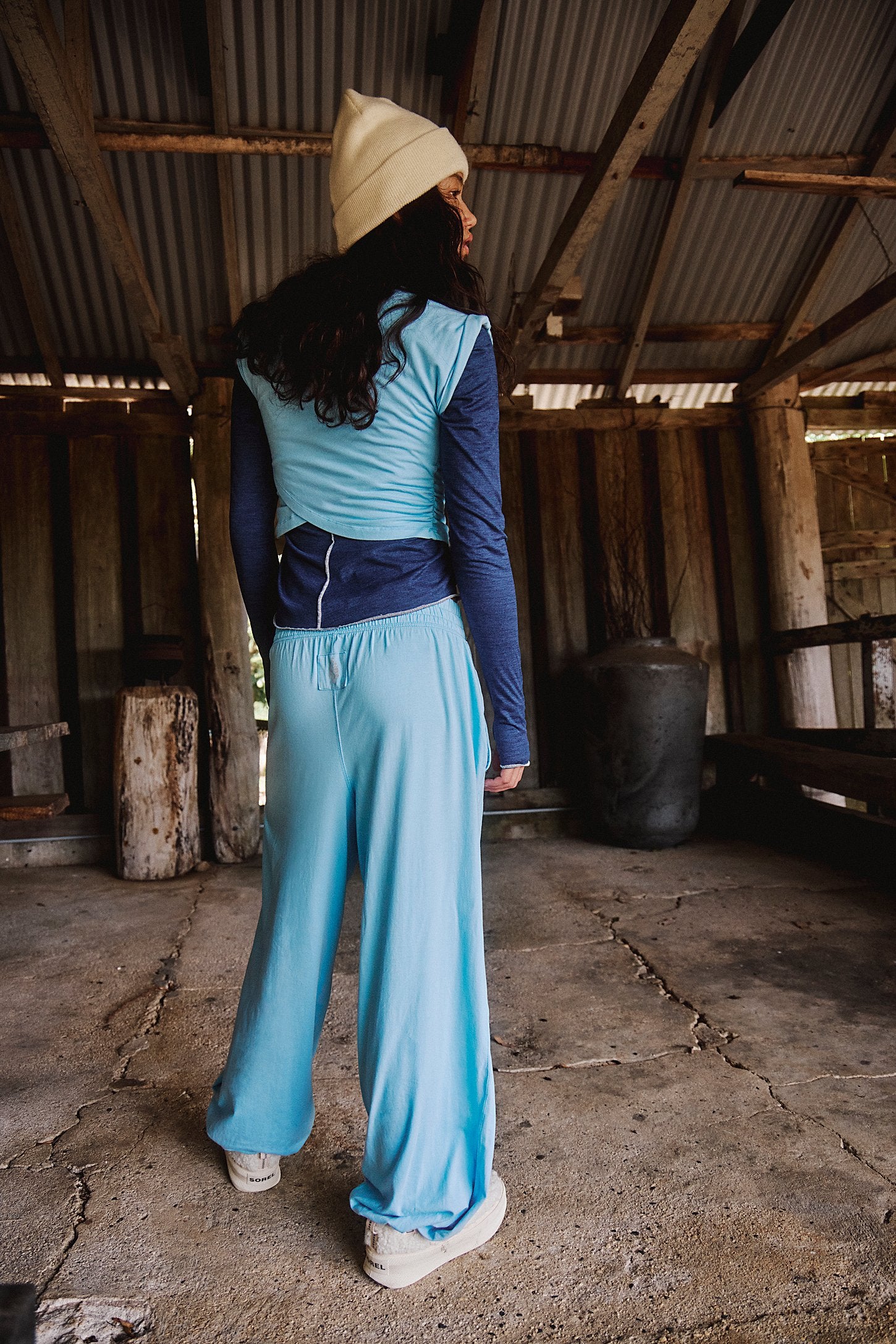 Features: Soft, jersey fabrication; relaxed fit; cropped muscle tee top with seaming detail; ankle length pant with high-rise waist and wide leg; elasticated waistband and cuffs; crossover detail on top; ribbed collar; side seam pockets