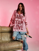 This oversized top features a sheer floral lace body with shimmering red sequin lettering spelling out “TEAM LOVE” across the front, and a bold “84” on the back for that vintage athletic feel. Contrast red neckline and sleeve stripes add a retro pop, while the roomy fit keeps it easy and comfortable.