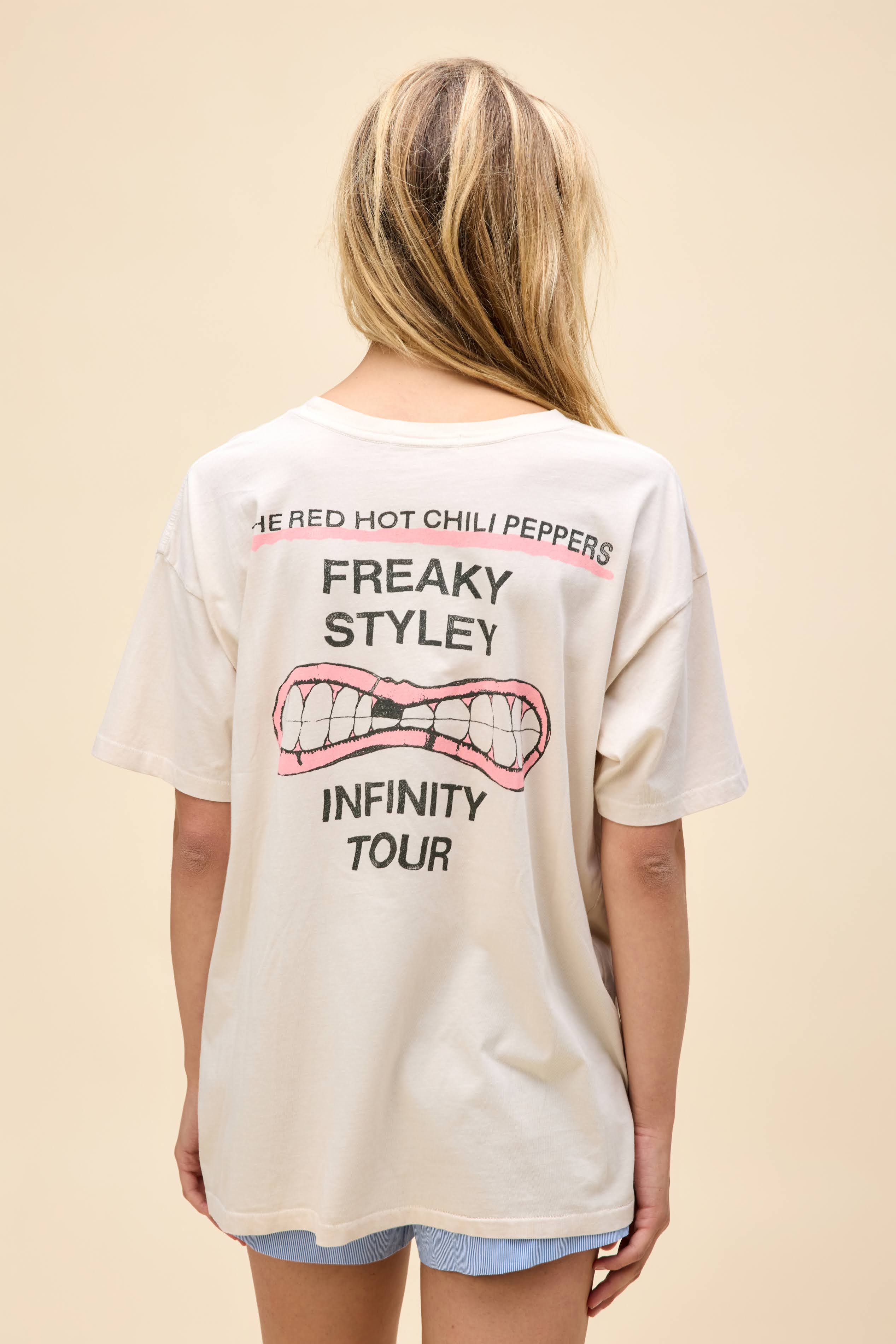 Dominating the 90s as one of the best selling bands of all time, the Red Hot Chili Peppers' signature sound has gone unmatched, ultimately rocketing their second studio album "Freaky Styley" and its corresponding Infinity Tour into major wins. The essence of a merch booth find pays homage to said successes with an original rendition of their iconic asterisk logo with added pepper graphics and their recognizable infinity smile slapped on the back.