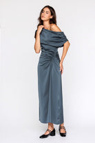 Sleek, sculptural, and undeniably chic, the Elara Dress is made for moments that call for effortless glamour. Designed in a soft teal green fabric with a subtle sheen, this one-shoulder midi features elegant side ruching that flatters every curve and creates a timeless silhouette.