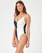 The Devi One Piece is our classic coverage style that takes things to the edge with its deep-v neckline. Color blocking adds to the elegance and molded cups along with a twist at the waist make this the perfect suit to lounge in the sun or chase after the kids on the beach!