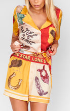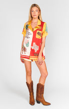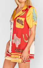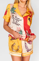 Kick back, cowboy style. The Home & Away PJ Set brings rodeo flair to your lounge game with silky-soft fabric, bold Western prints, and a relaxed fit that’s as cute on the couch as it is on coffee runs. The button-down top and elastic waist shorts make it effortless to wear—whether you’re home for the night or headed out for margs with the girls.