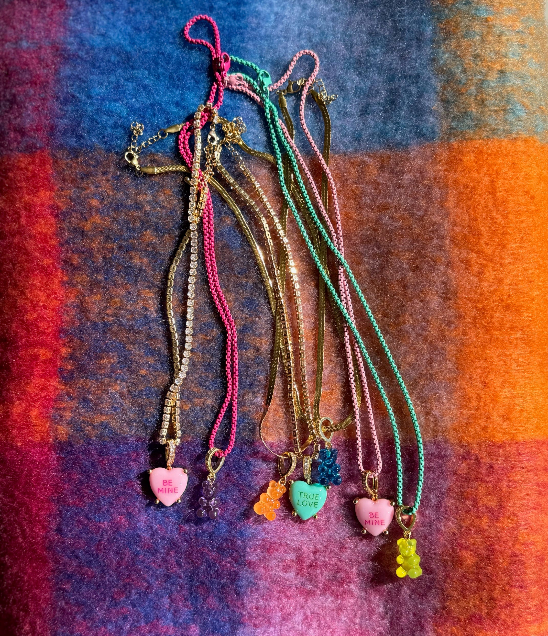 Wear your heart on your neck with our Be Mine Pink Heart Necklace. Inspired by conversation candy hearts, this quirky necklace is a sweet addition to any outfit. Perfect for Valentine's Day or any day you want to spread some love. XOXO!