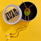 Details Designed in the USA Gold-plated enamel olive charm measures 1.19 in H x 1 in W with high-gloss red pimento cabochon 28 in easy-slide gold-plated snake chain with pearlescent droplet ends Features engraved MackBecks logo on back of charm Packed in a signature MackBecks window tin — collectible, giftable, and pantry-ready