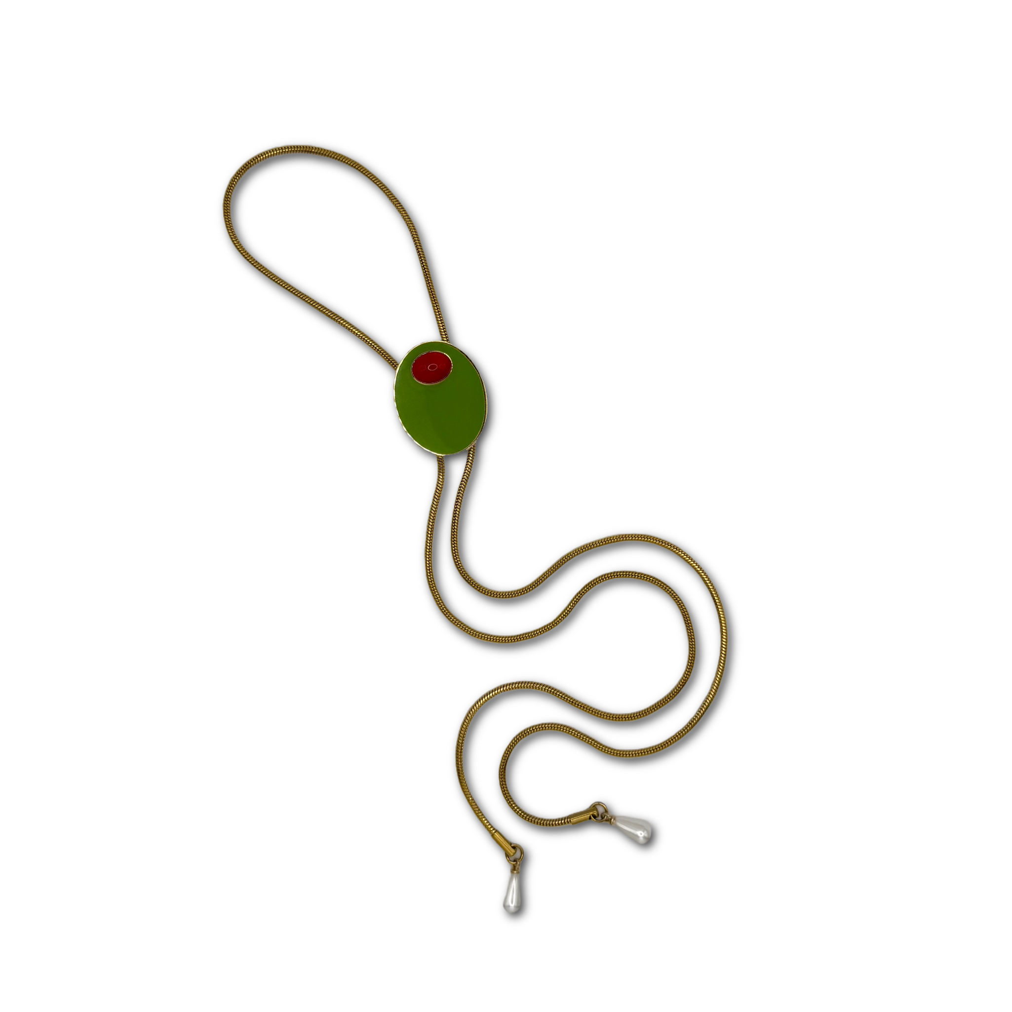 A happy hour essential — bold, brined, and designed to wear on repeat. The Olive Bolo Necklace is a new signature in the MackBecks pantry — a bold, brined charm styled like your favorite garnish and strung on a gold-toned snake chain with easy-slide bolo adjuster.